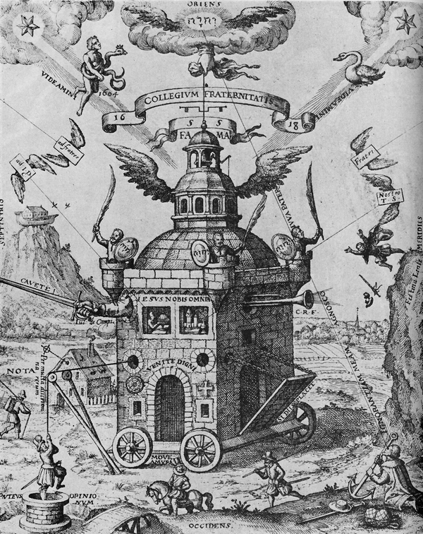 寓意画“圣灵之馆”。画面最上方的神火与云雾中显现神名与双翼,神之手加持的圣灵之馆拥有羽翼和车轮,意指它并非真正的馆驿,而是无所不在的精神共识。画面背景远处停在亚拉腊山顶的挪亚方舟象征着洪水过后的精神世界(见《信条》第七章)。屋顶的蔷薇十字团员手执写有神名的盾牌和鹅毛笔作为武器,象征着蔷薇十字运动乃是思想与学问的斗争。馆驿里设有实验室,代表追寻自然科学奥秘的实践,墙壁上的蔷薇与十字代表宗教的虔敬。左下方从井中被救出的人物就是C.R.C,这是第三文献《化学的婚礼》的开篇一幕,象征着精神的升华。圣灵之馆上方则是蛇夫座和天鹅座的新星,象征着即将到来的变革。摘自迪奥菲斯·施维格哈特所著《蔷薇十字的贤明之镜》(1618)。