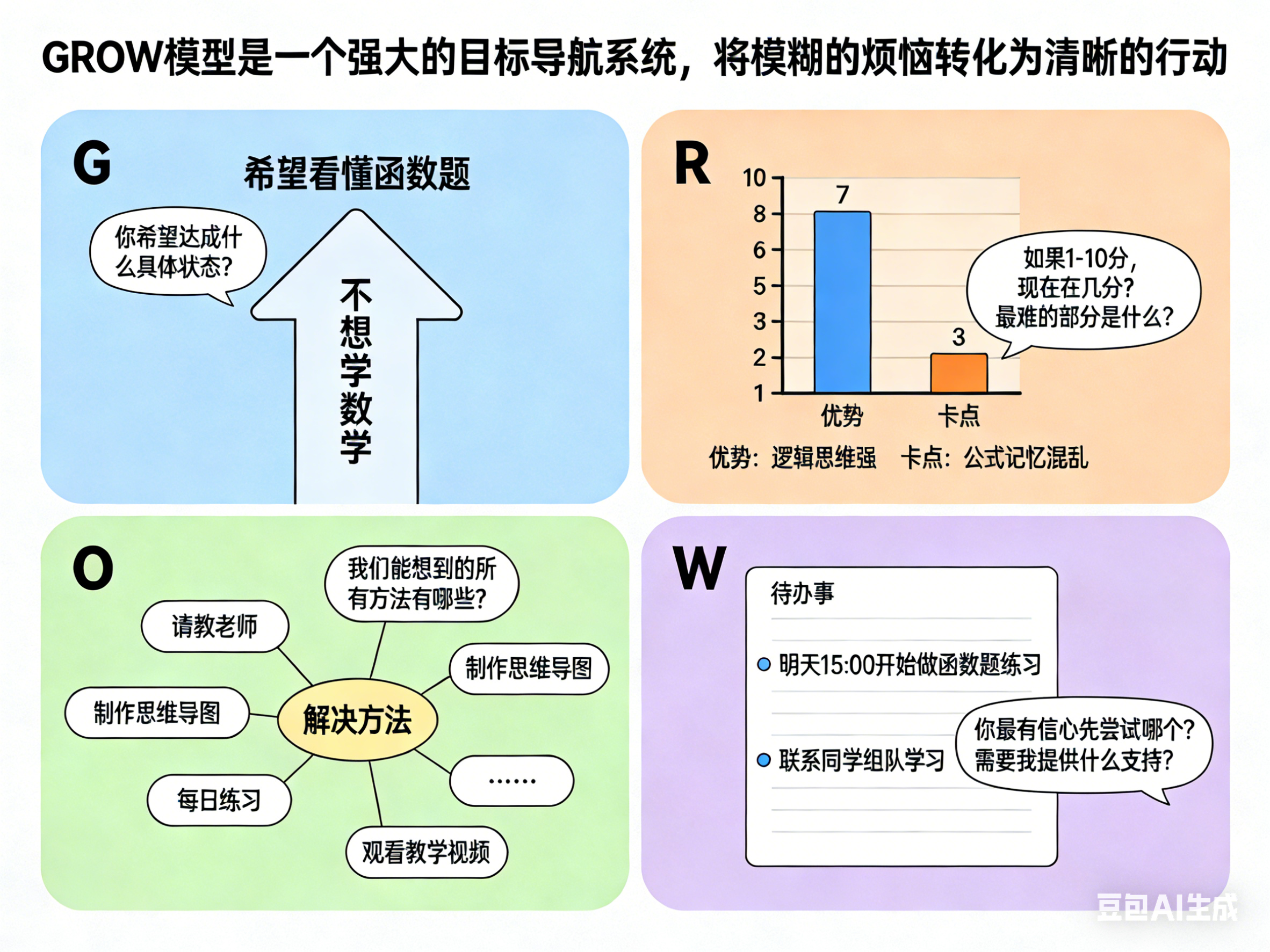 (教练旁白:大家看,第一步的目标设定,我们完成了两件关键事:一是把“学不好数学”这个模糊的、消极的抱怨,聚焦到了“函数”这个具体战场;二是引导孩子说出了“看到题有思路”这个属于他自身的、正向的、可努力的目标。这就是G,绘制地图。)