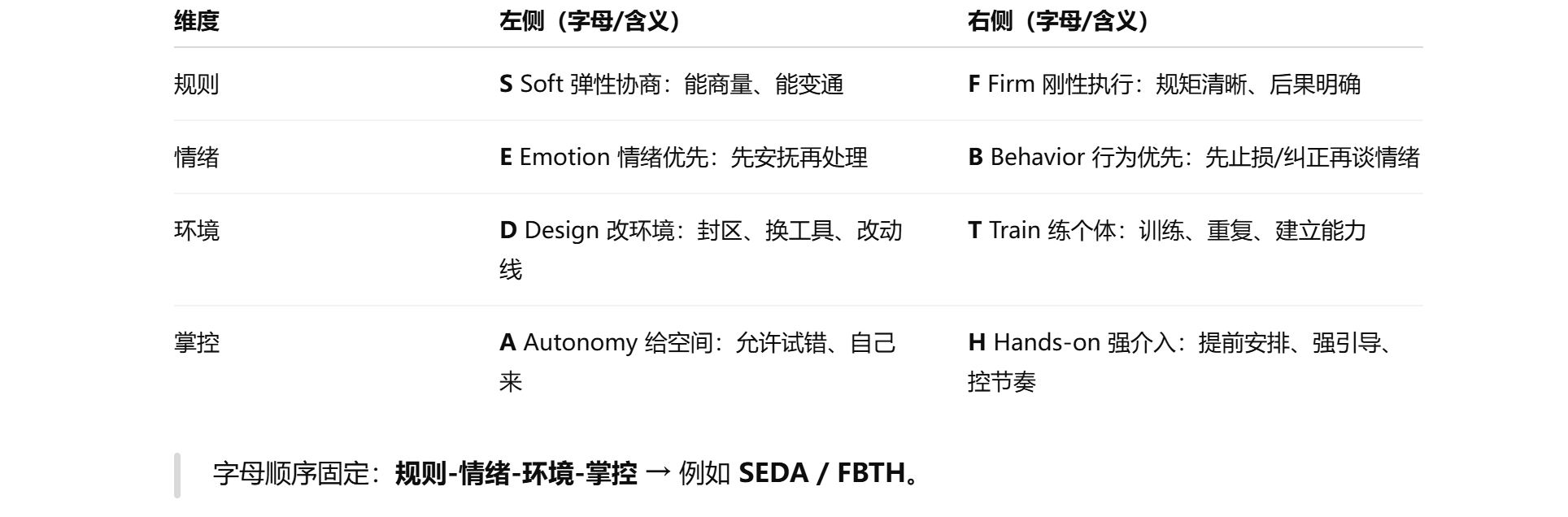 FBTA严谨放手型:要求高但不包办,强调能力训练和自我负责;盲点是容易让弱势方跟不上,需要更多脚手架。
