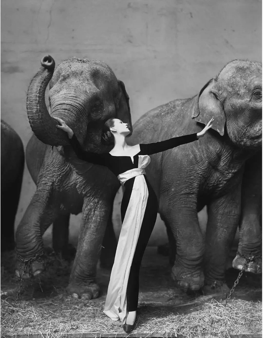 1955年巴黎马戏团的那个午后,成为时尚摄影史上的不朽瞬间。《多维玛与大象》中,穿着迪奥高级定制晚装的模特与拴着脚镣的巨兽相对而立,纤细与粗粝、现代与原始形成强烈碰撞。Richard Avedon 虽遗憾模特腰带未能与象腿形成完美呼应,但这帧充满张力的作品,早已超越了时尚记录的范畴,成为"对比美学"的典范。在摄影教学中,这正是值得深思的一课:刻意的不完美往往比精致的复刻更具生命力,而元素的反差组合,能让画面产生直击人心的叙事力。他镜头下的时尚从不只是衣饰的展示,而是人物灵魂的外化,正如他所言:"我更关心的是鲜亮衣帽之下,女性头脑中的东西"。