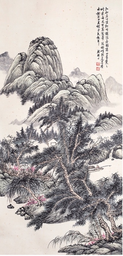 此画摹南田山水。别是造化,生出大木顶天立地之意,山居隐舟自成天地之游逸。尤精妙在设色,如南田语“画至着色,如入炉钩重加锻炼,火候稍差,前功尽弃。三折肱知为良医,画道亦如是矣”。