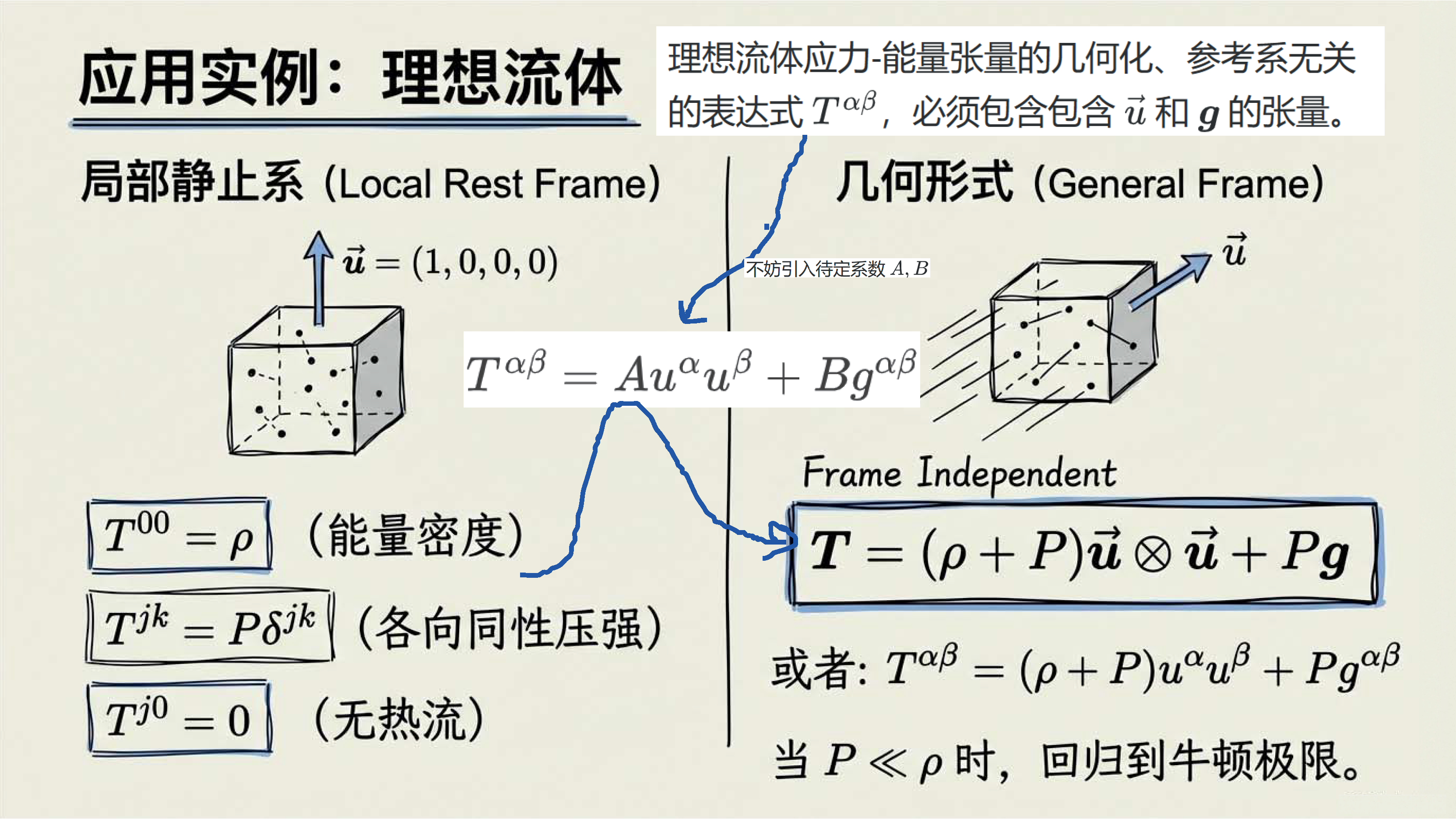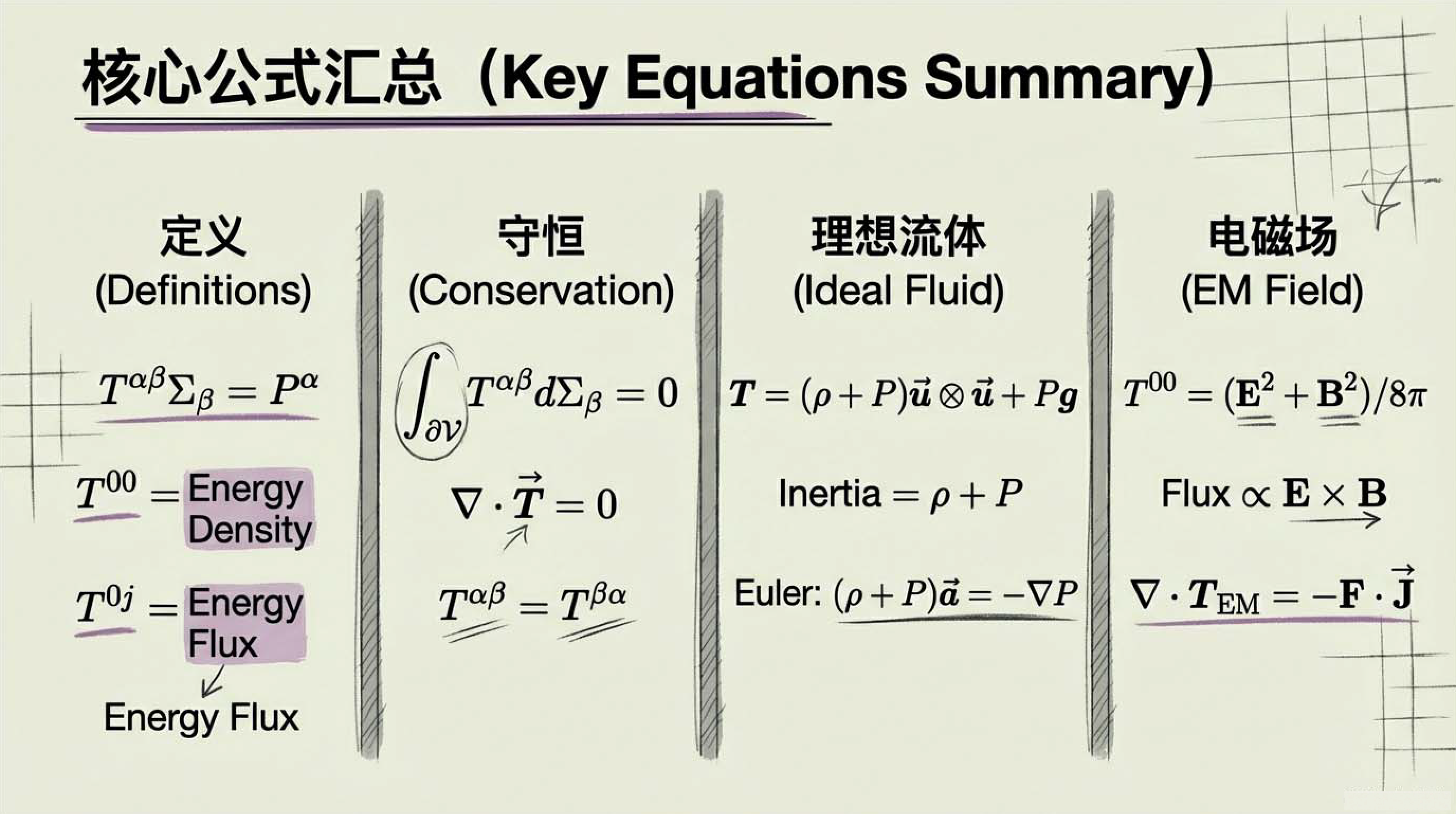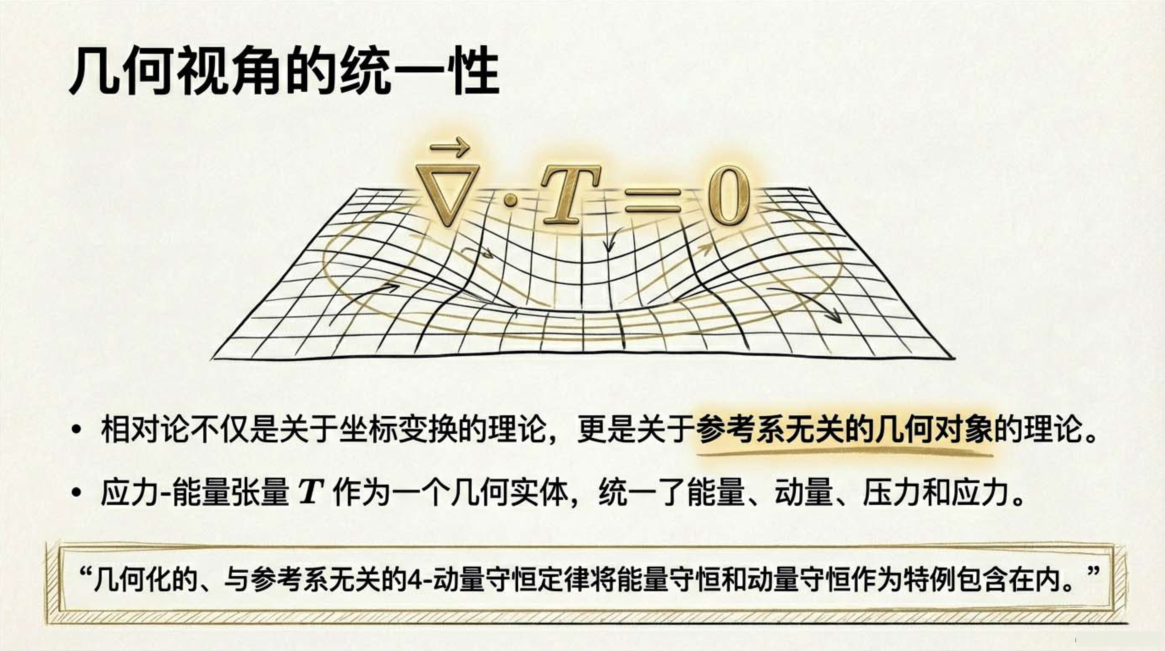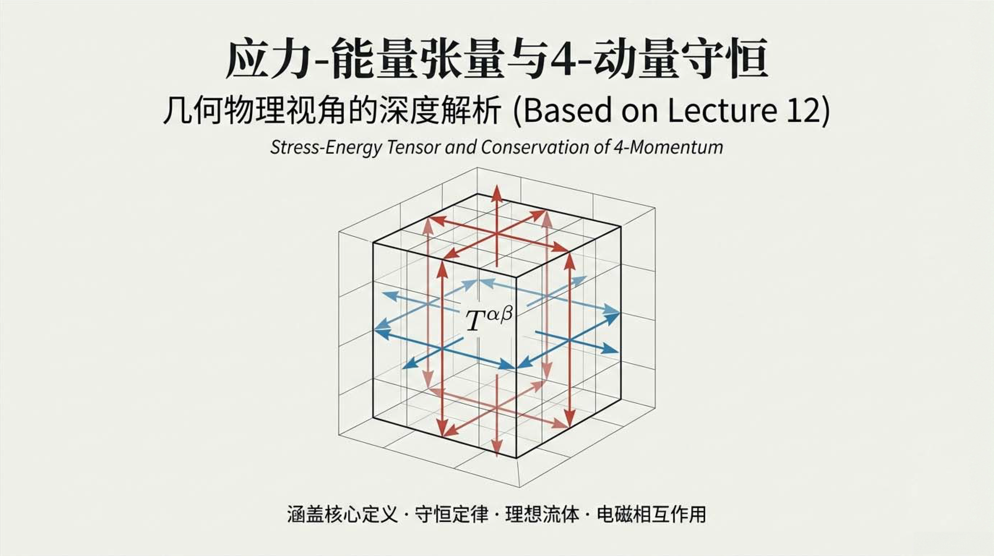 本课引入了应力-能量张量来表述4-动量守恒,它是牛顿应力张量在时空中的几何推广。其分量涵盖了能量动量的密度与通量,且因物理自洽性而具有对称性。利用高斯定理,全域守恒律可转化为局部形式。课程还分析了理想流体与电磁场的张量模型,为研究相对论动力学奠定了基础。