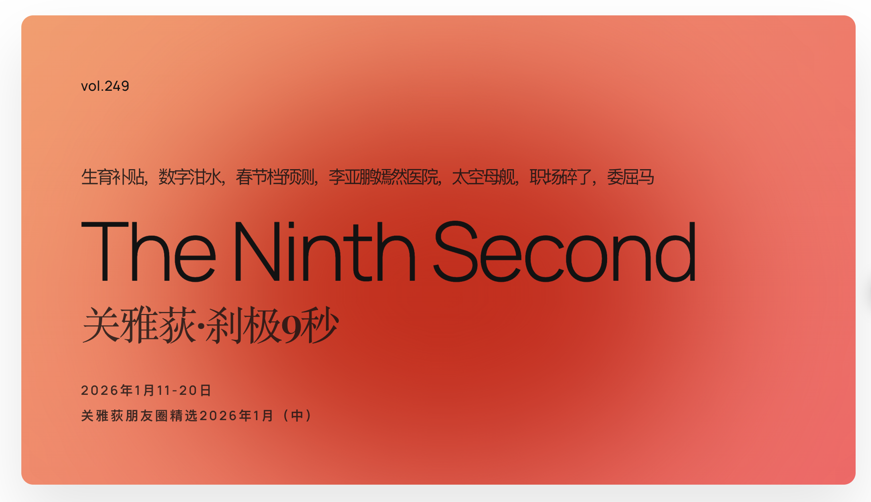 在当代传播语境下,碎片化的信息记录往往被视为时代的噪音,但当这些碎片经过系统性的梳理与深度的社会学观照,便能转化为极具价值的时代样本。本期《关雅荻·刹极9秒》通过“朋友圈精选”这一形式,完成了“私域内容公域化”的战略尝试。通过对2026年1月11日至20日的生活记录进行复盘,节目不仅记录了一个创作者的个体成长,更精准地捕捉到了中国社会在育儿焦虑、技术异化与星际博弈中的脉动。
