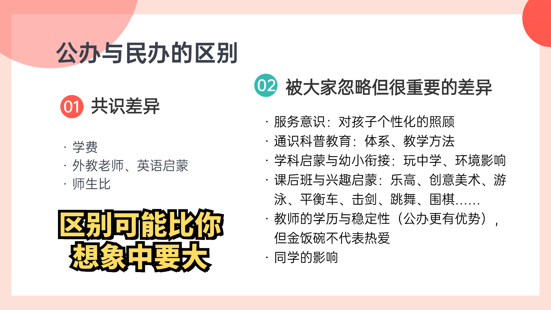 教学理念与内容: 公办园活动丰富但知识性内容少;优质民办园能实现“学”与“玩”的高效融合,并提供丰富的兴趣班。
