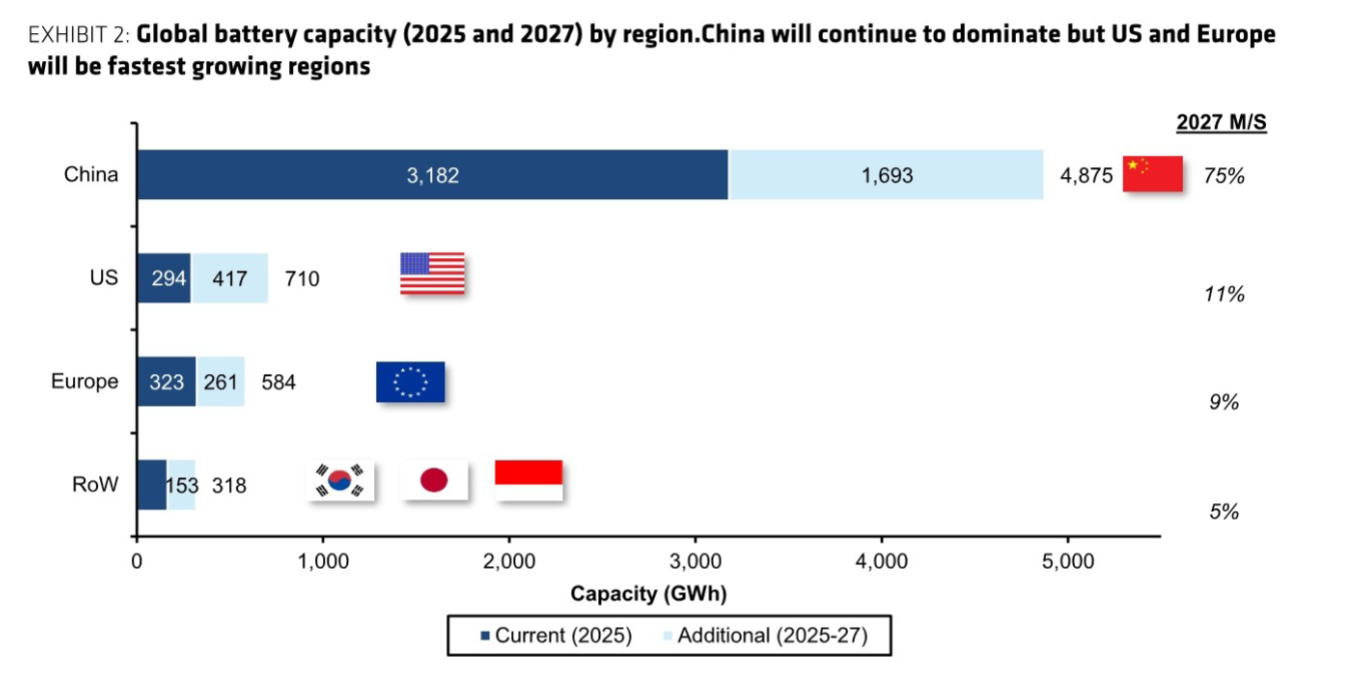 图表1(EXHIBIT 2:全球电池产能区域分布) 清晰显示,2027年中国产能将达4875GWh,占全球75%,美国710GWh(11%)、欧洲584GWh(9%)。中国凭成本与先发优势持续主导,但美欧增速更快,未来十年将逐步提升份额。