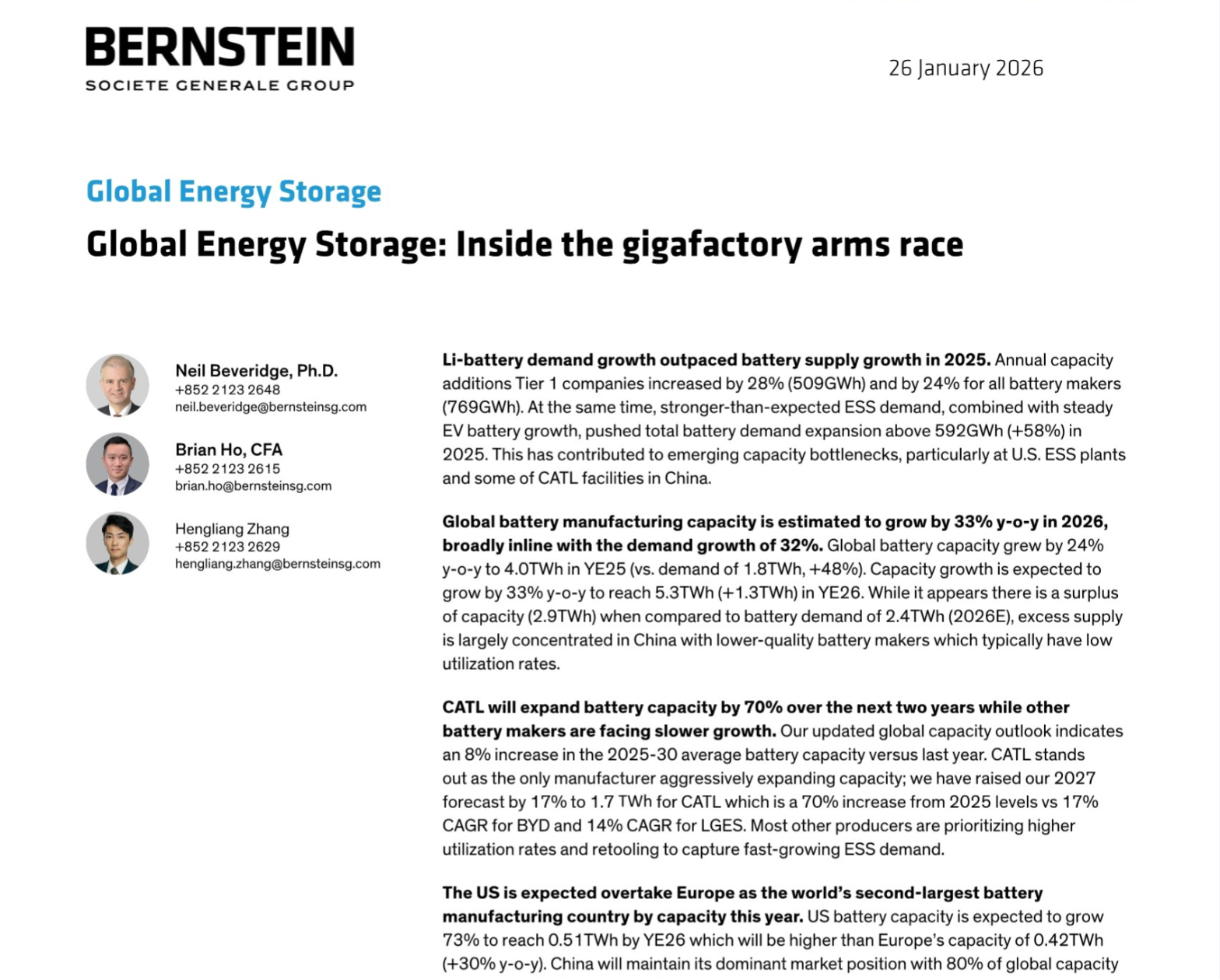 这份硬核分析来自伯恩斯坦(Bernstein)2026年1月26日发布的《Global Energy Storage: Inside the gigafactory arms race》研报,核心结论直白:全球电池产能竞赛已进入白热化,宁德时代(CATL)独领风骚,中美欧区域格局重塑,LFP与高镍技术成关键战场。