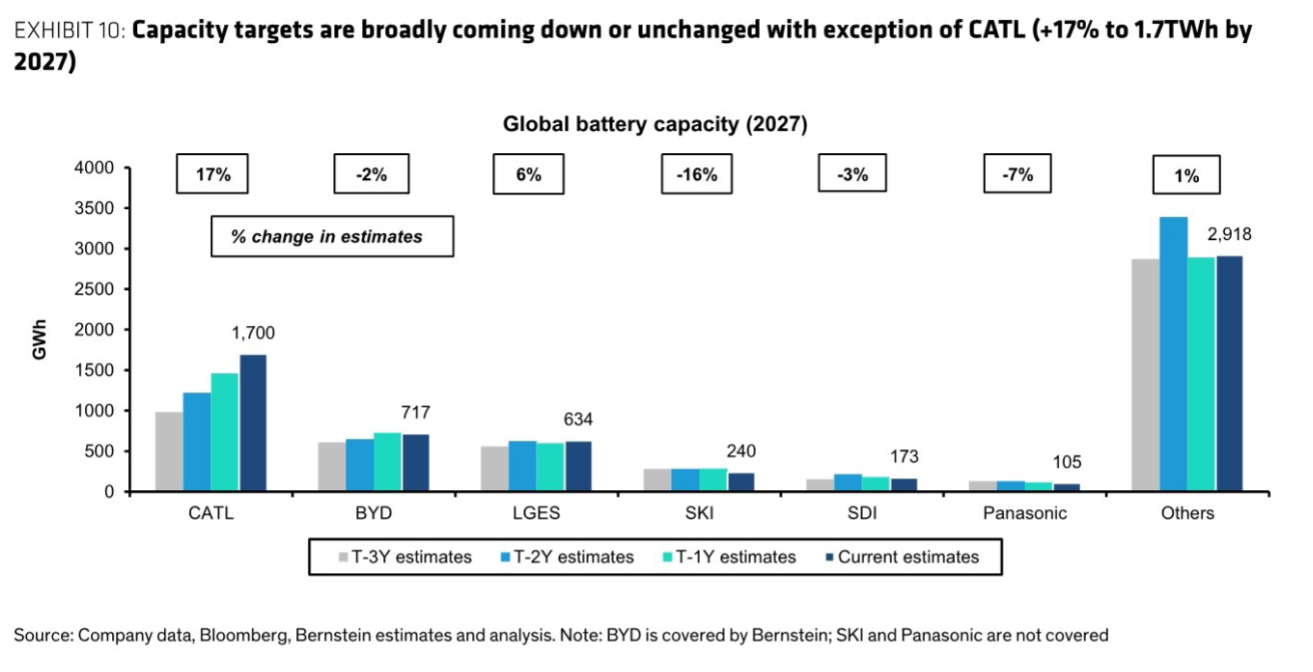 图表2(EXHIBIT 10:2027年全球电池厂商产能预测) 揭示关键格局:宁德时代2027年产能上修17%至1.7TWh,较2025年激增70%,远超比亚迪(717GWh)、LGES(634GWh)。其他厂商多聚焦产能利用率提升,唯有宁德时代激进扩产,其溧阳LY8工厂从签约到量产不足一年,扩张效率行业领先。