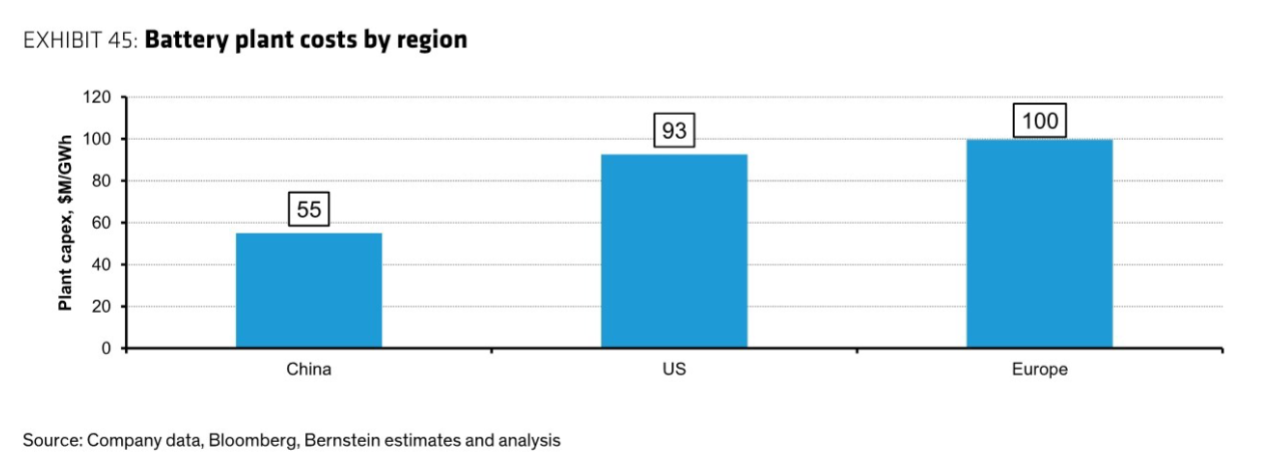 图表4(EXHIBIT 45:区域电池工厂成本对比) 暴露核心差距:中国工厂平均成本5500万美元/GWh,美国9300万,欧洲1亿。宁德时代更是低至5000万美元/GWh,成本优势支撑其全球扩张,而欧洲新厂成本普遍超1亿美元/GWh,竞争力偏弱。