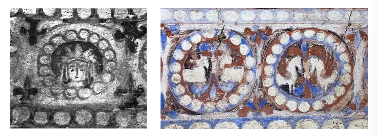 ▲ 北齐徐显秀墓 联珠菩萨纹 VS 莫高窟277窟 联珠翼马纹