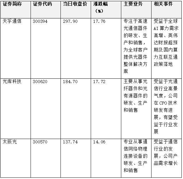◦ 领涨个股:天孚通信(+17.76%)、光库科技(+17.72%)、太辰光(+14.06%)。