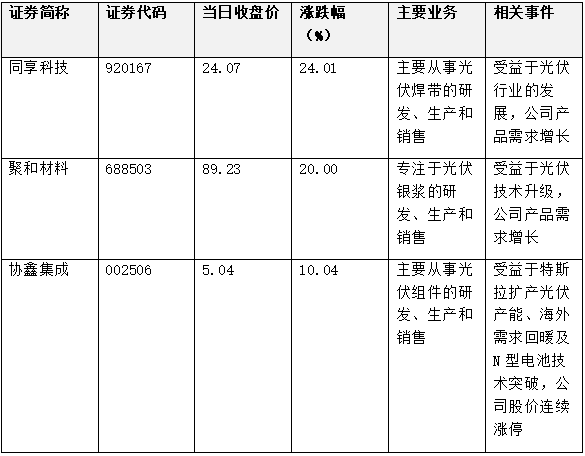 • 利空事件:财政部和税务总局日前发布《关于调整光伏等产品出口退税政策的公告》提出,自2026年4月1日起,取消光伏等产品增值税出口退税,可能对光伏企业出口产生一定影响。