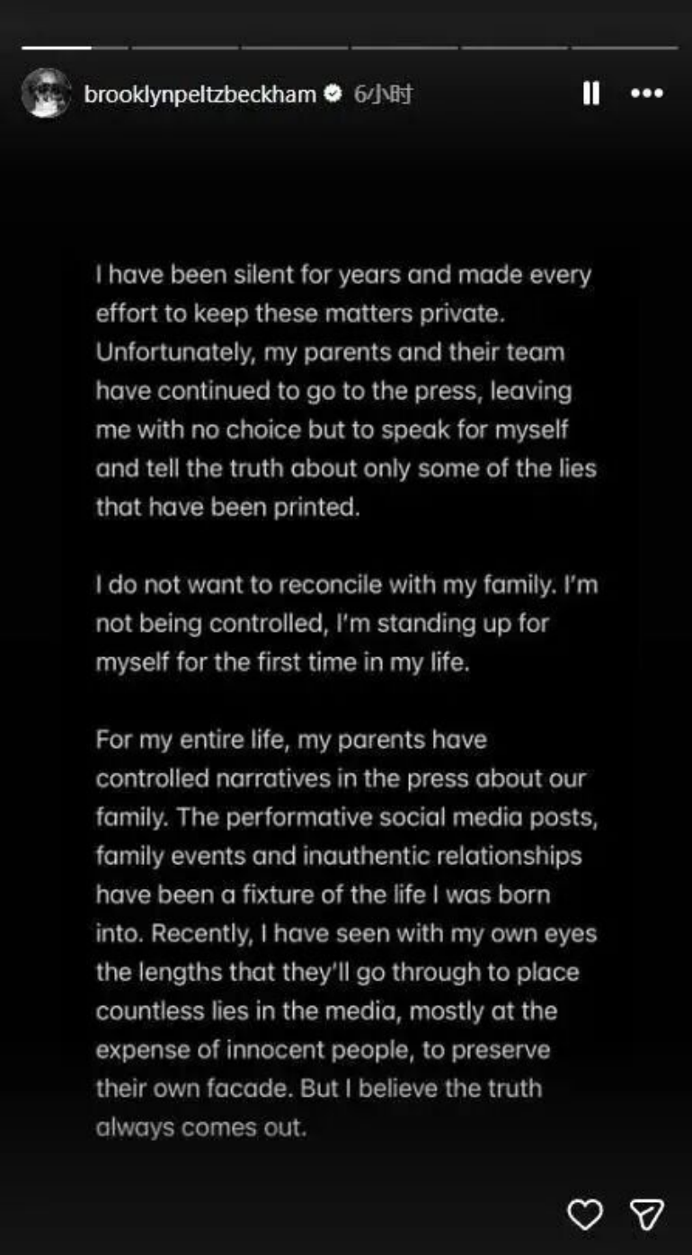 1月19号,贝克汉姆的大儿子布鲁克林在自己千万粉丝的社交媒体上公开发长文,控诉父母对他的控制,直接把他结婚以来媒体揣测的各种八卦坐实了,这相当于把家族这么多年来一直经营的“完美家庭”人设按在地上摩擦。