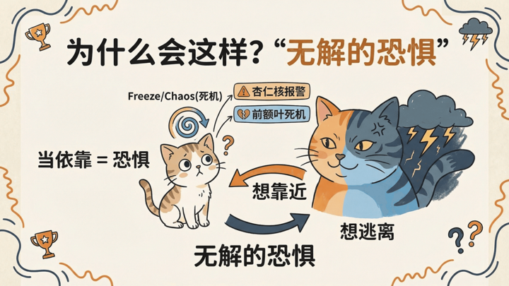 无解的恐惧 (Fright without Solution): 混乱型依恋形成的核心机制,即个体唯一的安全来源(如父母)同时也是其恐惧的来源,导致其陷入生物学上的行为悖论。