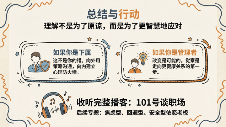 在本期节目将带你深入理解这种"时而天使,时而魔鬼"的行为模式背后的心理学根源。我们不仅会从依恋理论的学术源头说起,拆解其核心的"无解恐惧"悖论,更会提供一套完整的实战策略,帮你"向外沟通"建立边界,"向内调节"保护能量。最后,我们还会"借假修真",探讨如果你自己身上也有这样的影子,该如何走向"可得的安全感"(Earned Security)。