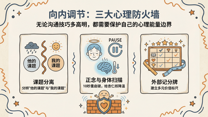 向内三招,守住能量:课题分离解脱自我攻击、正念身体扫描重启理性大脑、外部记分牌建立客观评价体系。