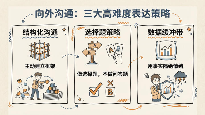 向外三招,有效沟通:结构化沟通对抗混乱、选择题策略降低决策负荷、数据缓冲带隔离情绪碰撞。