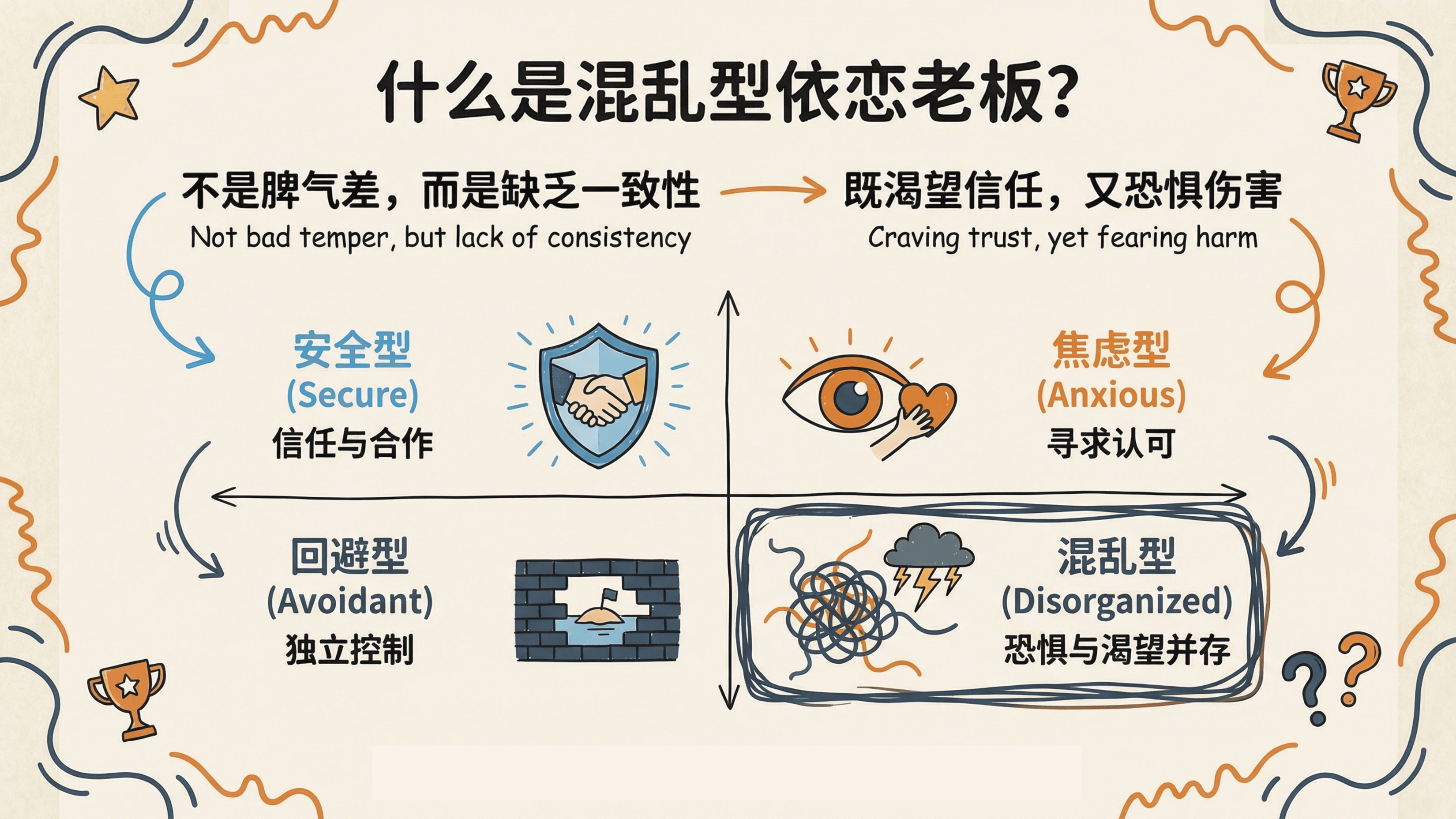 上一秒还称兄道弟,下一秒就让你如坐针毡,情绪像坐过山车一样,永远不知道下一个弯道是高峰还是低谷。很多人将此归结为老板的"御下之术"或"脾气差",但今天我们想提供一个更本质的视角:混乱型依恋(Disorganized Attachment)。