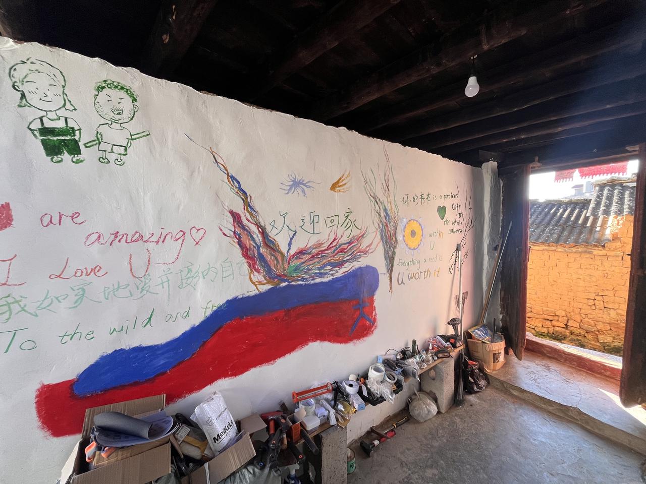 朋友们画的画和写的寄语布满进门后一侧的白墙