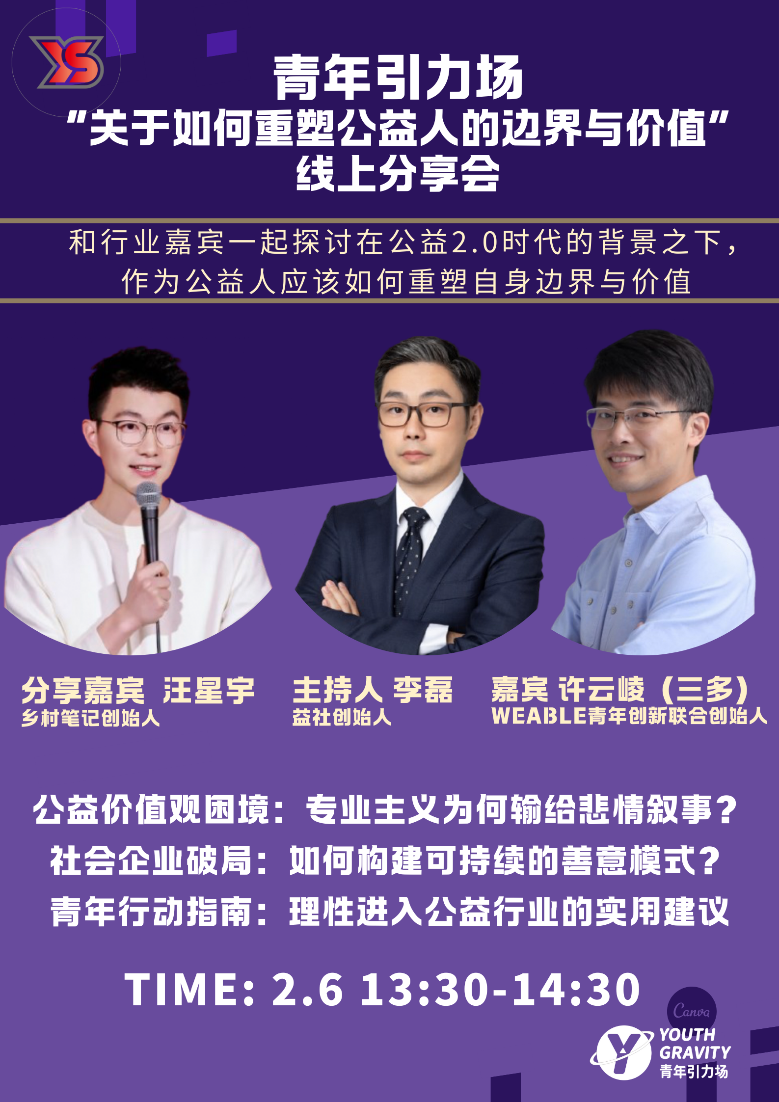 开篇与嘉宾介绍:从陈行甲高薪争议、李亚鹏公益项目模式困境切入,引出传统慈善与现代公益的讨论。嘉宾:三多(青年赋能)、汪星宇(乡村振兴)。
