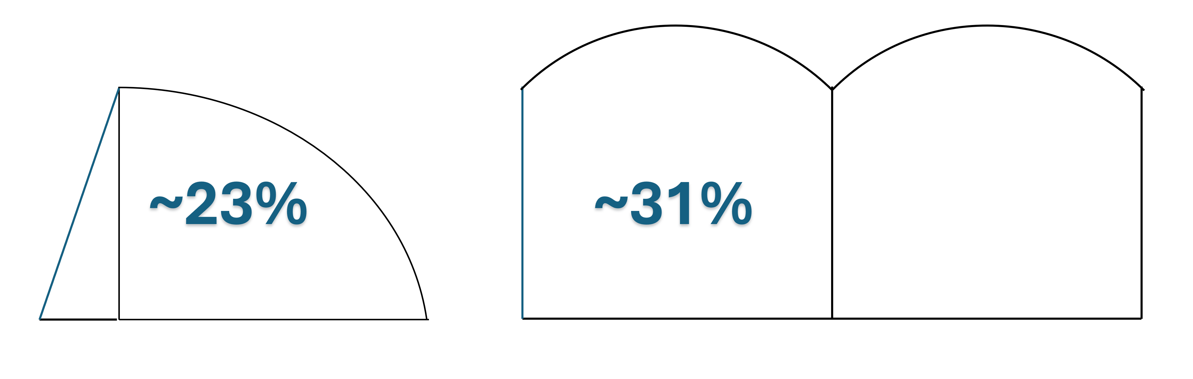 本图基于二维剖面示意,将温室除地面以外的外边界视为外露面,并以边界长度近似表示外露面积;后墙(或北墙)占比,则以其在外露边界中的长度比例表示。图中蓝色线段表示后墙,其余外边界以黑色线段表示;图中的百分比数字即为“后墙占总外露面积”的占比(示意值)。