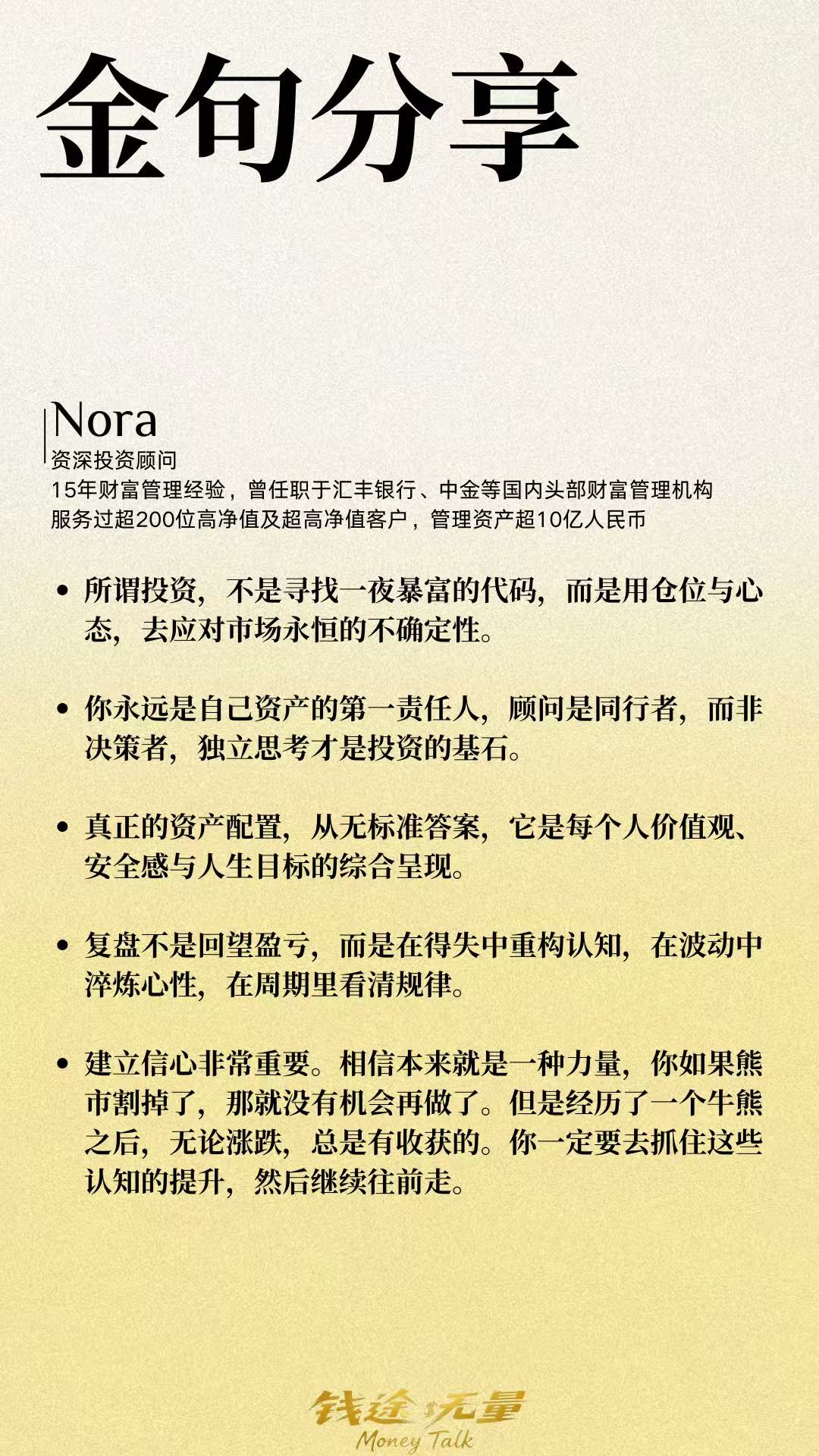 Nora见过太多高净值客户的起起伏伏,也经历过市场最残酷的“毒打”,这一期,没有所谓代码和玄学,只聊最朴素、最长期、最健康的财富观,不是赌运气猜涨跌,而是学会认清自己、选对工具、做好应对。
