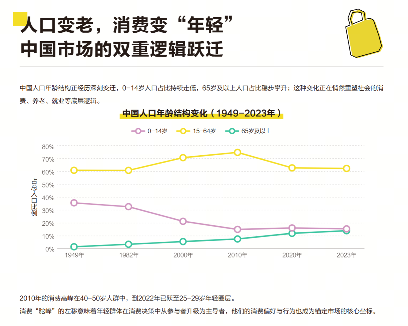 图1(P02 中国人口年龄结构变化1949-2023):0-14岁人口占比持续走低,65岁及以上占比稳步攀升,但消费“驼峰”从2010年的40-50岁,直接左移到2022年的25-29岁,年轻人彻底掌权消费决策。