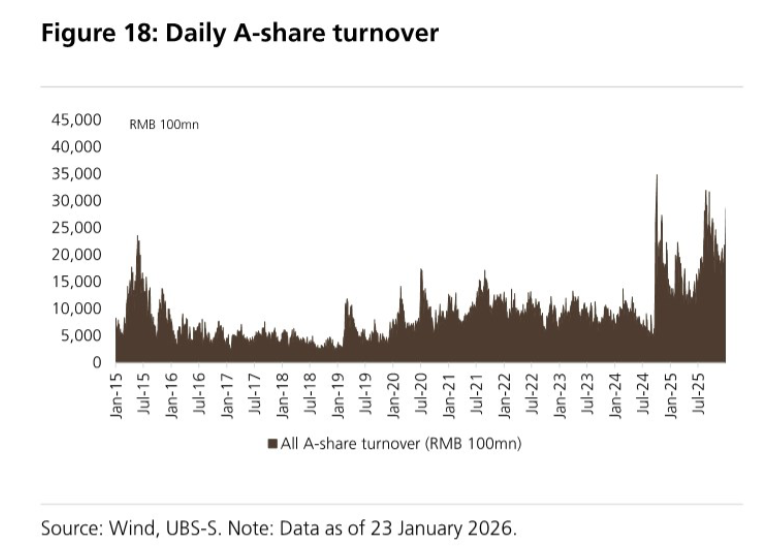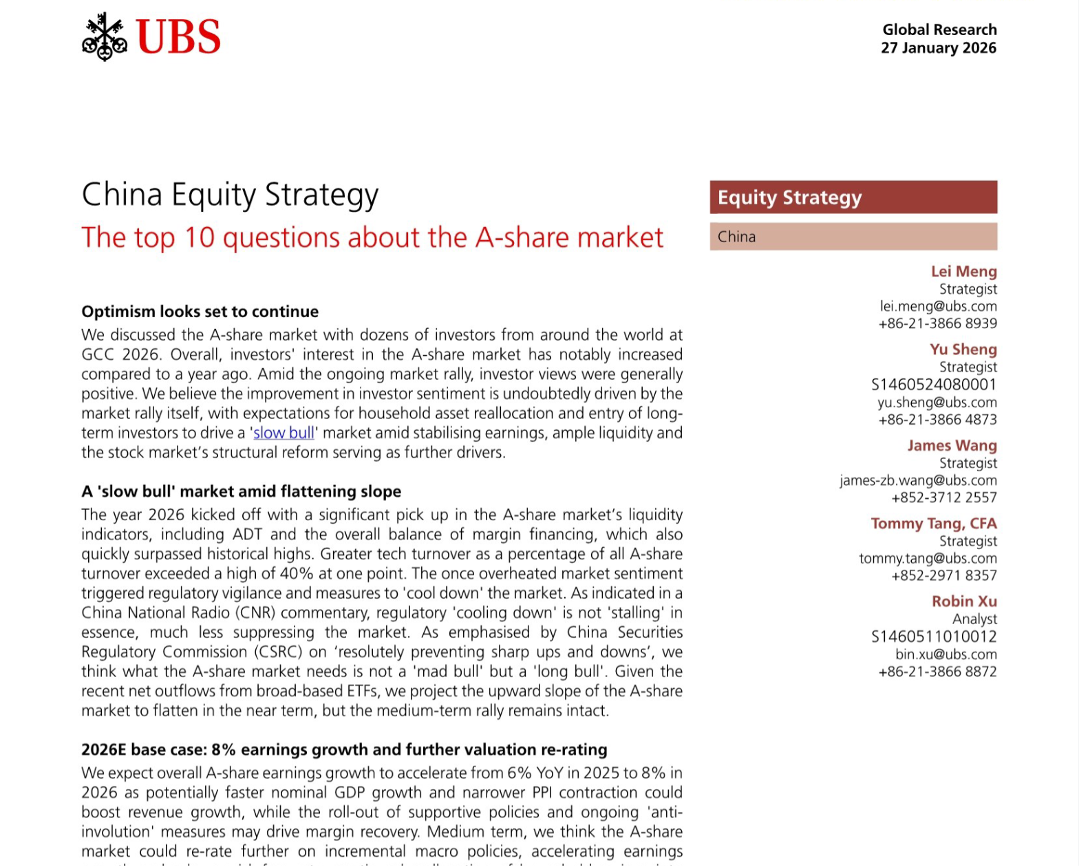 瑞银2026年1月27日发布的《A股市场十大核心问题》研报明确指出,A股乐观情绪将持续,虽短期上涨斜率趋平,但中期慢牛格局不变,全年盈利增速有望从2025年的6%升至8%。