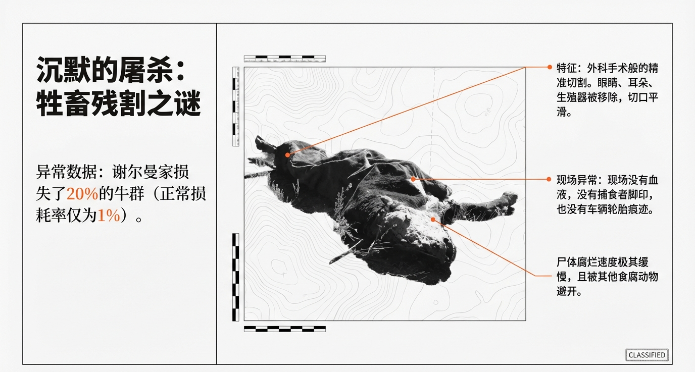 本期《失眠街区》,我们将目光投向美国犹他州的尤因塔盆地。这里有一块被诅咒的土地——皮行者牧场(Skinwalker Ranch)。在过去的30年里,这里发生了一系列现代科学无法解释的现象:近距离被马格南左轮手枪击中却毫发无损的巨狼、在一夜之间凭空消失又在几十米外被“压缩”的牛、还有那个令NASA科学家都感到战栗的 1.6 GHz 信号。
