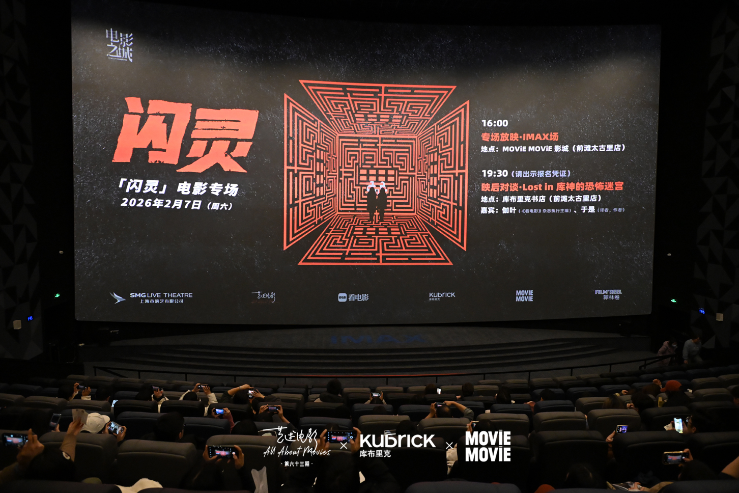 电影放映活动共吸引百余人在IMAX影厅一起体验沉浸式的心理恐怖;随后的映后对谈活动特别邀请文学译者于是老师、《看电影》杂志执行主编迦叶老师与听众们共同lost in库神的恐怖迷宫。