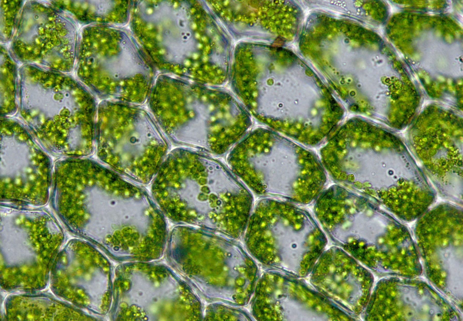 某种藓类植物叶细胞,中有颗粒状的叶绿体