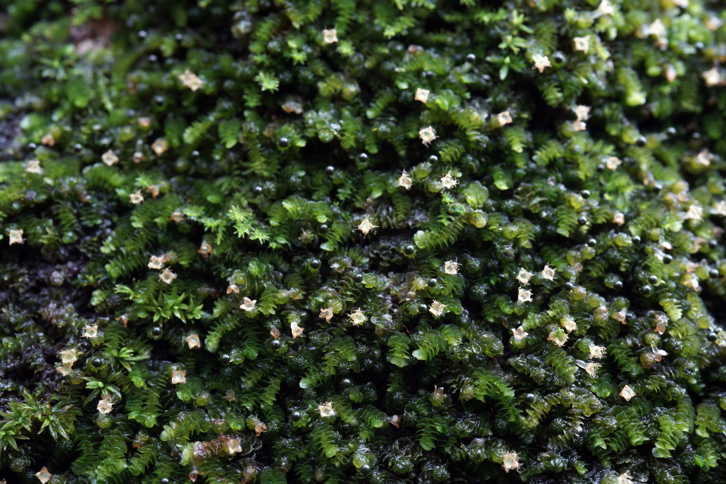 苔类的孢子体--南亚顶鳞苔,白色的已经开裂