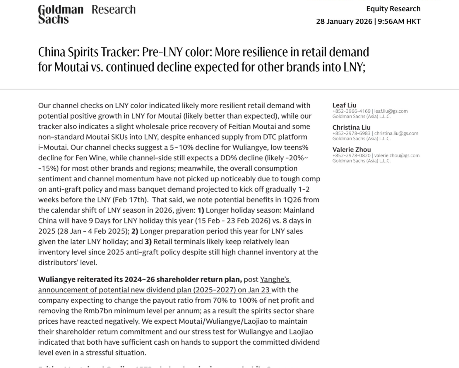 高盛于2026年1月28日发布最新中国白酒行业追踪研报,直指春节前白酒行业呈现显著分化格局:茅台零售需求展现超强韧性,春节期间有望实现正增长,而五粮液、汾酒及多数区域酒企需求均迎下滑,行业整体消费情绪未现明显回暖,仅春节档期调整为2026年一季度行业带来些许利好。