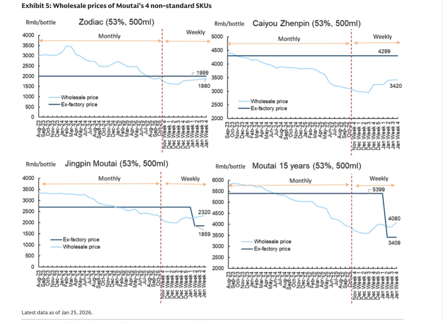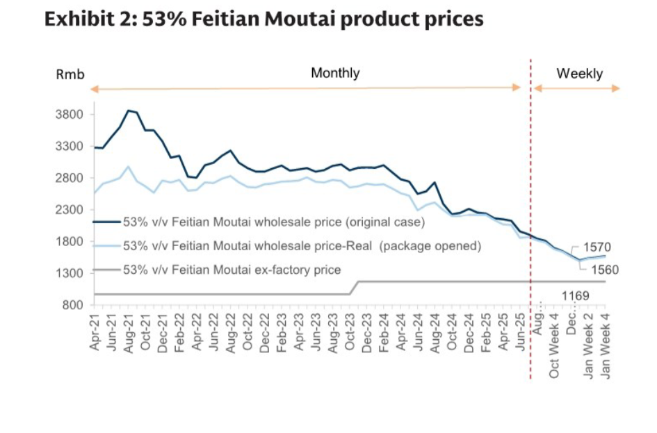 研报中多张图表直观呈现高端白酒价格走势,成为格局分化的核心佐证。研报第3页 Exhibit 2为53%飞天茅台价格图,数据截至1月25日,原箱飞天茅台批价涨至1570元/瓶、拆箱涨至1560元/瓶,近两周分别上涨35元、30元,2026年以来累计涨幅更显著,批价修复趋势明确;