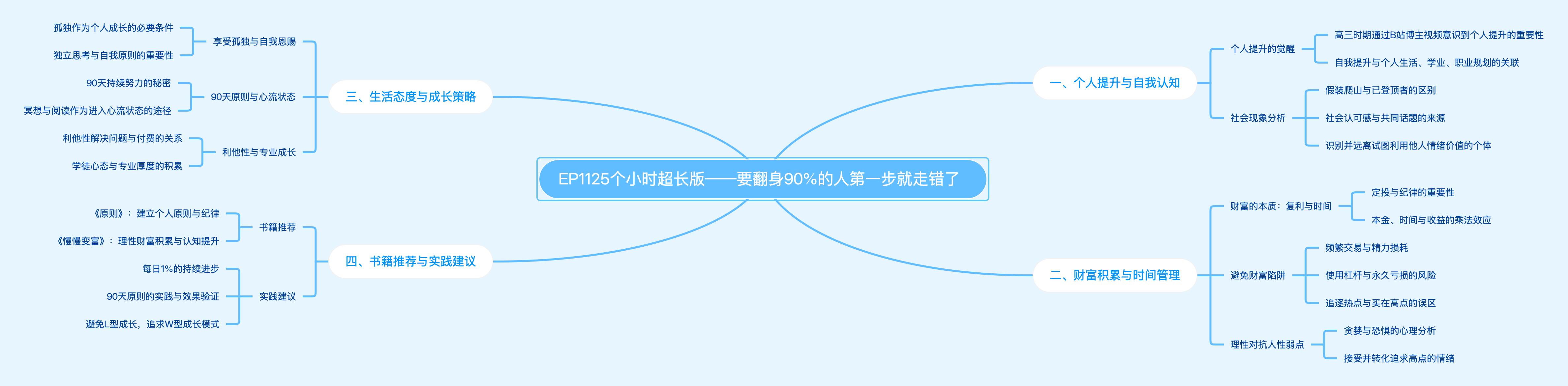 本期深入探讨了个人成长、成功定义、自我认知及行动与结果之间的关系。强调,成功不只在于达到目标,更重要的是成长与体验过程。提倡积极生活态度,鼓励自我挑战与超越自我限制,同时指出人们常受外界束缚,忽略内在需求。分享个人经验,提倡面对困难时的坚持与自律,保持身份认同的重要性,强调享受过程与珍视当下,不盲目追求外在成功。苏打贝拉通过比喻和案例说明,人生如爬山,应专注于内心的挑战,每天进步1%,通过90天挑战改变生活,不被外界干扰。还提到了自我反思和识别伪爬山者的重要性,保持方向和目标。还强调了心流状态、避免好运追求、W型与L型成长趋势的概念,以及如何利用AI工具分析个人情况来实现自我提升和幸福。最后,总结为追求稳定的持续提升,通过智慧的投资和自我投资,实现内在平静与对外界深刻理解,达到有意义的生活方式。