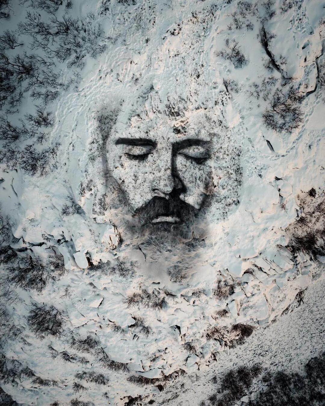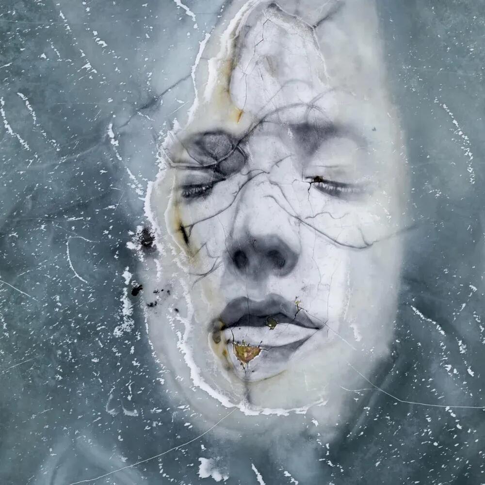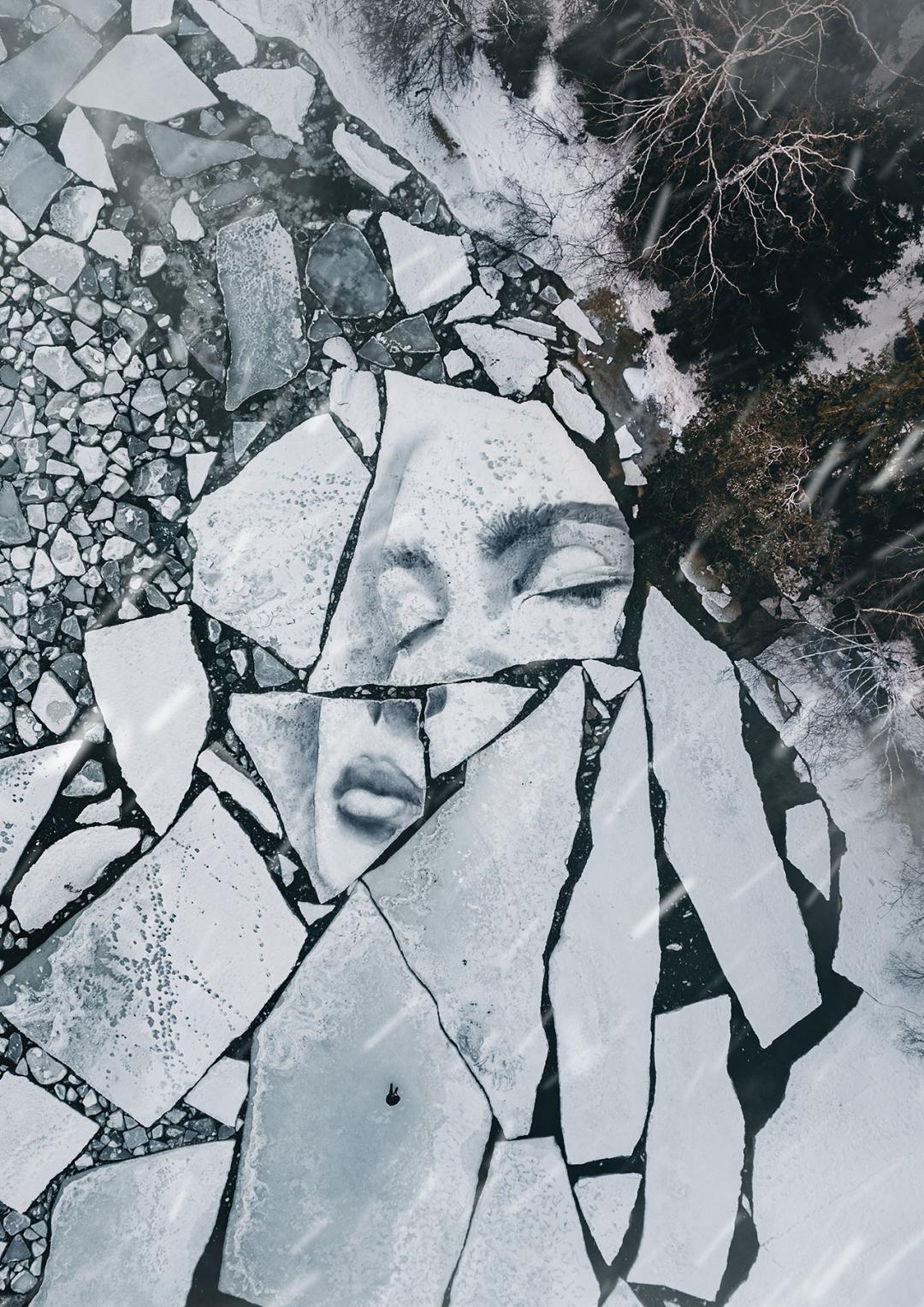 他以自然为画布,在波罗的海巨大的冰层上挥毫,用木炭勾勒出充满破碎感与力量感的女神肖像;又在挪威冰川的裂缝间来回穿梭,精心刻画被冰雪埋藏的少女形象。冰层随时可能断裂、漂浮、消融,极地的寒风与极端环境暗藏危险,他却始终坚守,让栩栩如生的人物肖像在冰冷的冰面之上缓缓浮现,成为大地之上最动人的轮廓。