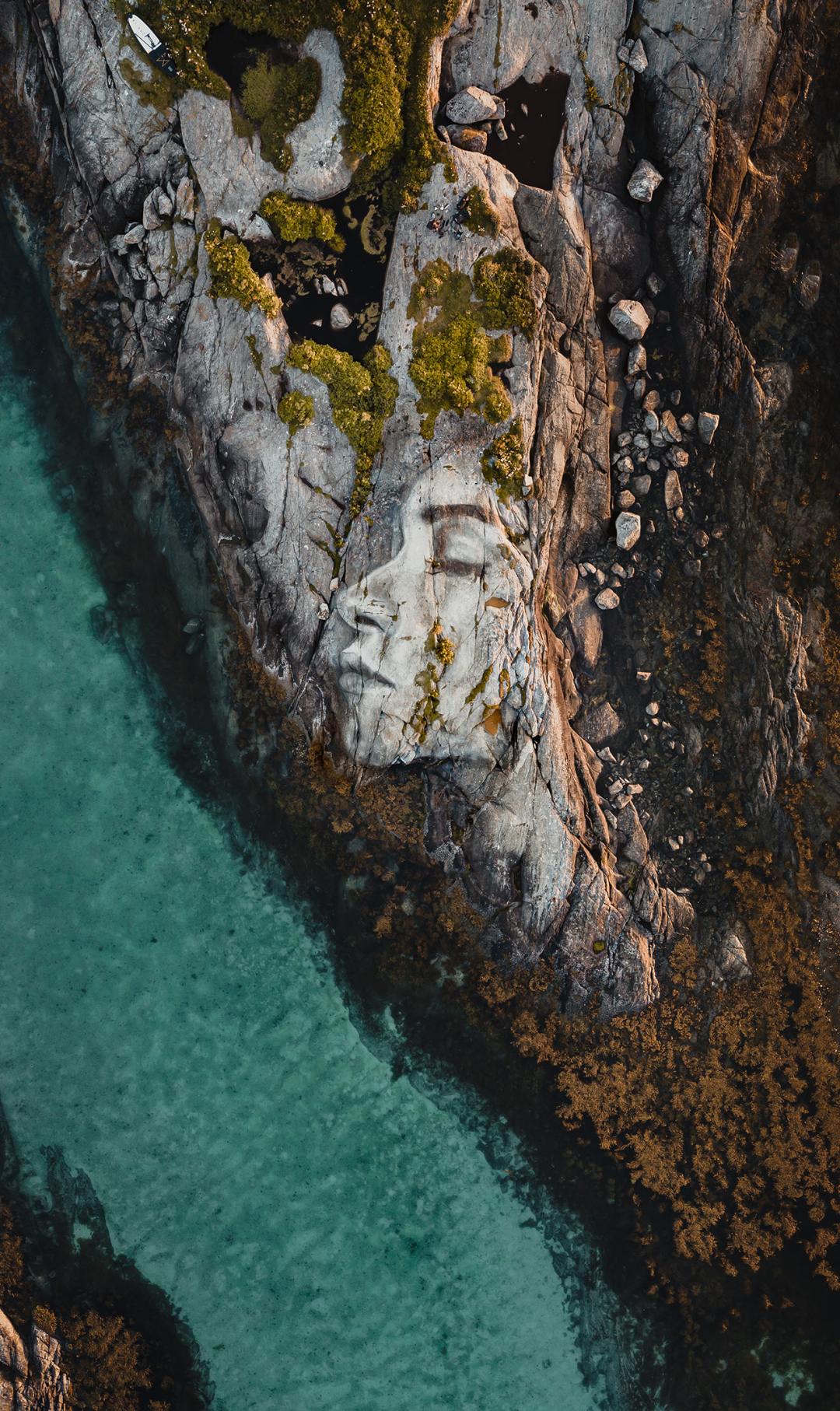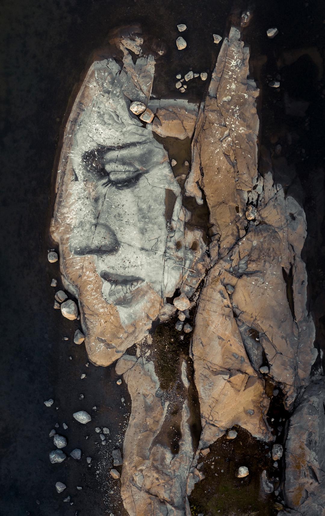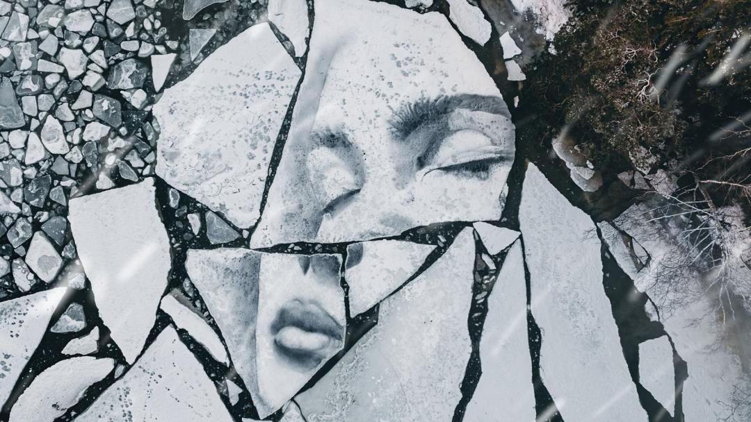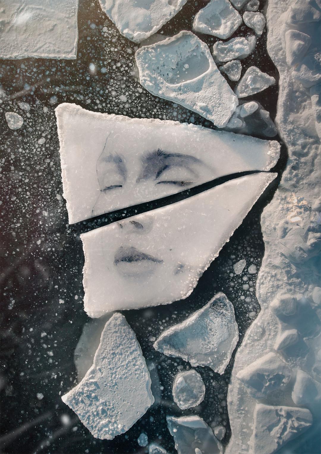 他以自然为画布,在波罗的海巨大的冰层上挥毫,用木炭勾勒出充满破碎感与力量感的女神肖像;又在挪威冰川的裂缝间来回穿梭,精心刻画被冰雪埋藏的少女形象。冰层随时可能断裂、漂浮、消融,极地的寒风与极端环境暗藏危险,他却始终坚守,让栩栩如生的人物肖像在冰冷的冰面之上缓缓浮现,成为大地之上最动人的轮廓。