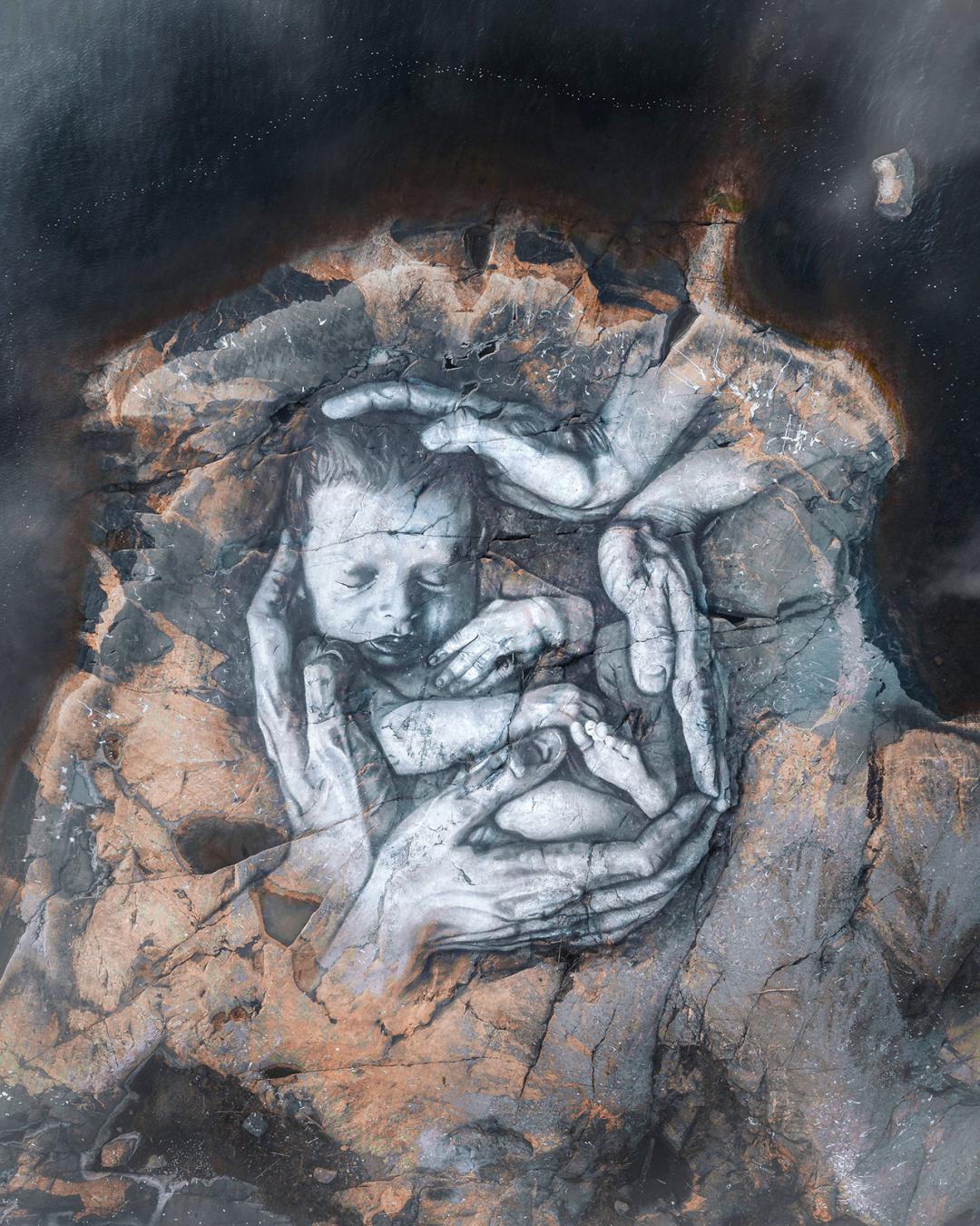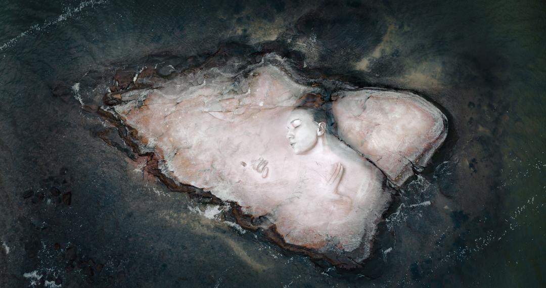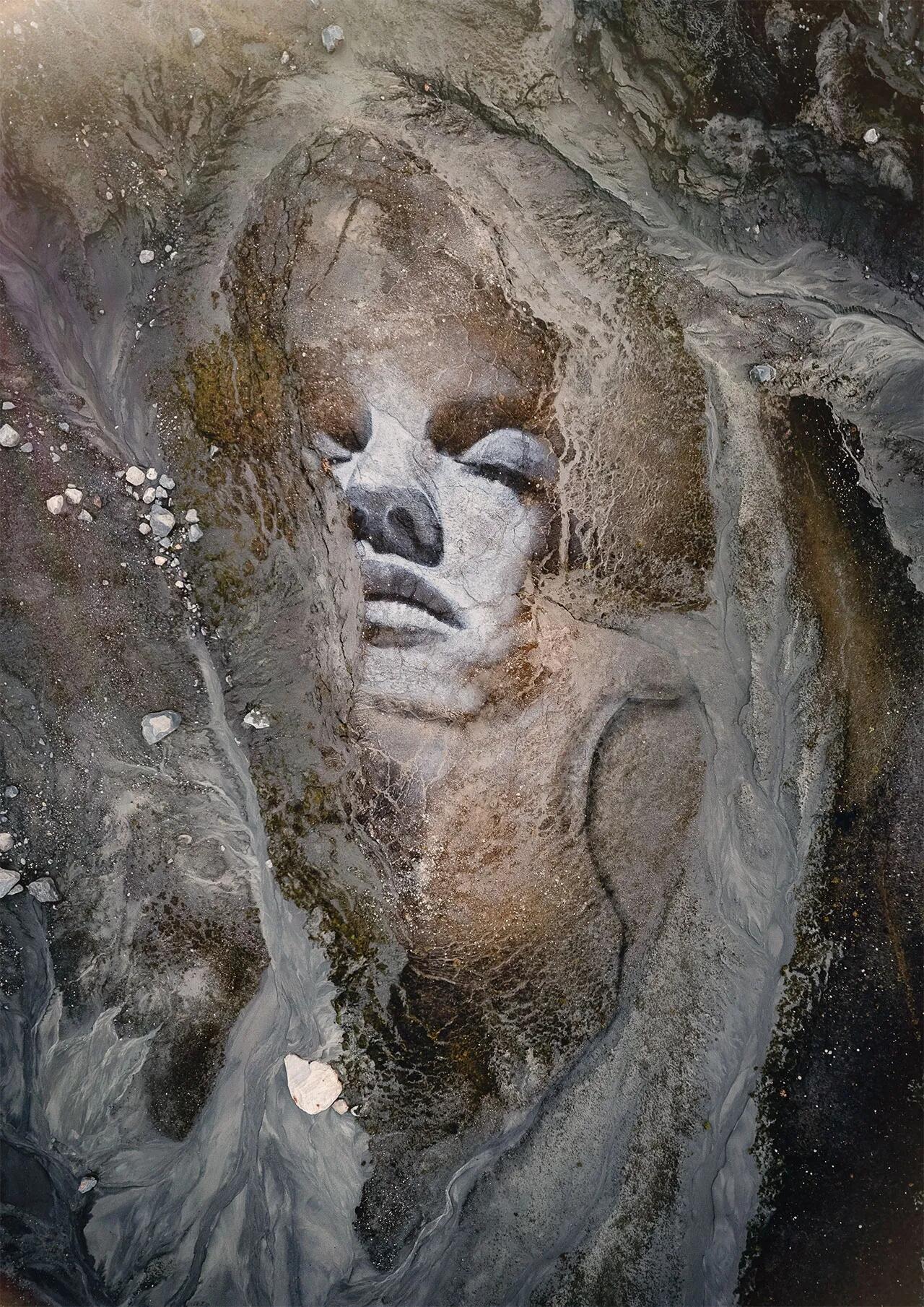 其代表作更是摄影创作的经典参考:波罗的海冰面之上的《冰原女神》,以破碎冰层为底,木炭线条勾勒出的肖像与冰裂纹路浑然一体,脆弱又震撼;挪威冰川中的《埋藏的少女》,于险峻裂缝中落笔,将生命的坚韧与自然的冷峻完美融合;犹他荒漠中的新生画作,以黄沙为墨,将父爱与生命的初啼定格在旷野之中;挪威群岛的蝶翼画作,虽被海水侵蚀残缺,却成为短暂艺术最动人的注脚。这些作品或随浮冰消融,或被风雪掩埋,却在镜头中成为永恒,诉说着自然与生命的深刻联结。