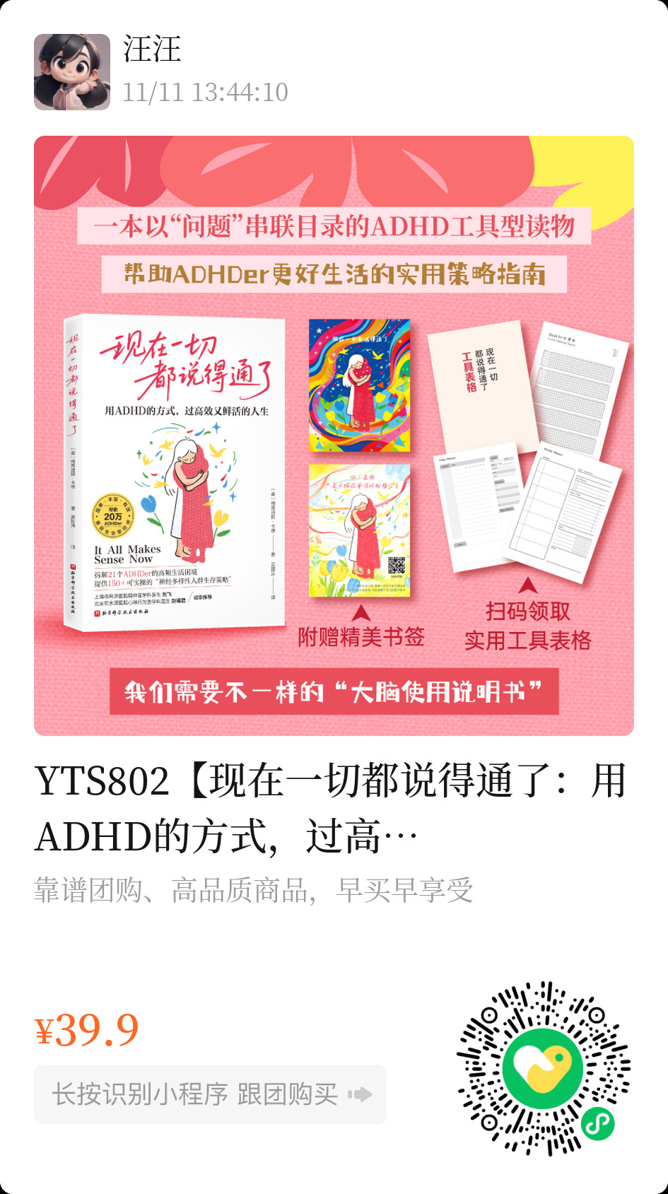 想要阅读本书原著吗?原著不仅有更加全面的生活建议,还有针对ADHD症状的“五色辅助阅读卡”,汪汪和小棠给灶友们申请了购书折扣,点击本链接购买即可享受灶友折扣