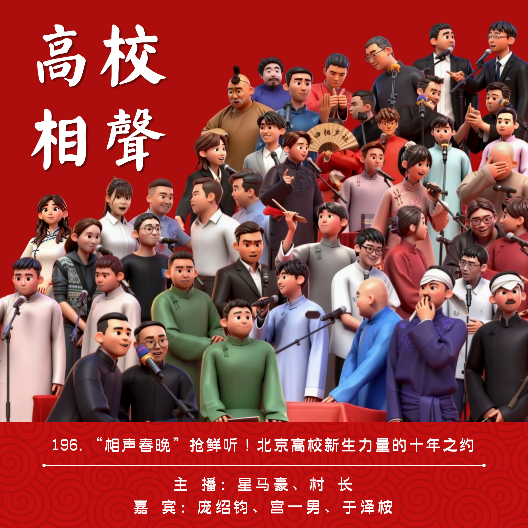而今天这期,咱们先来预热一场不一样的“相声春晚”:老听户都知道,星马豪和村长都曾在大学时期率领自己所在相声社团的“学生老合”登上过「京城高校相声联盟」的巡演舞台,我们也曾在之前的几期节目里反复回忆当年那些帮助我们打下相声基础的社团岁月。