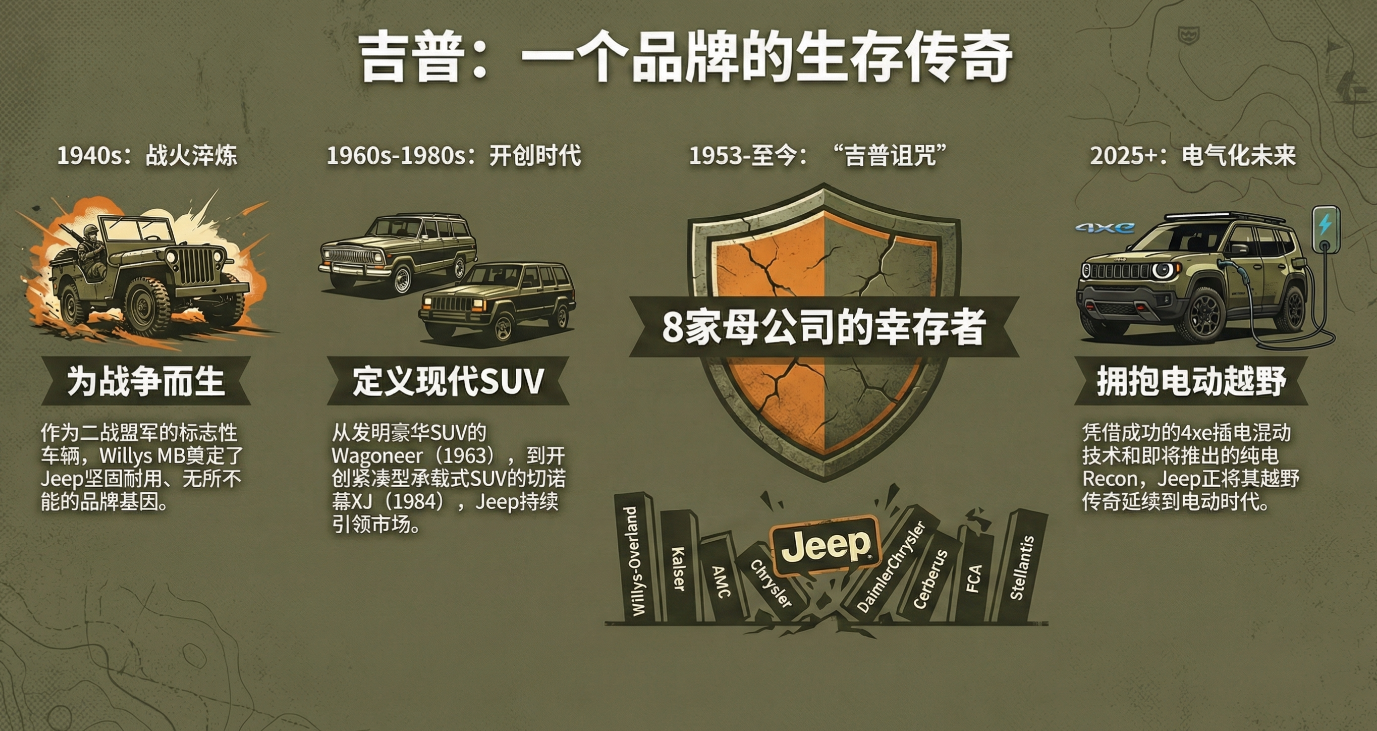 - 关键论点:吉普的生命力极强,每次危机都成为其进化的催化剂,使其能够不断适应并超越拥有它的母公司。