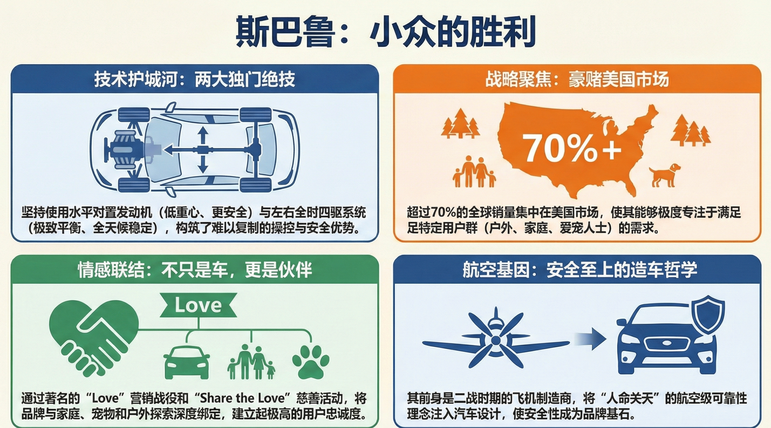 - 斯巴鲁的百年历史是一部生存哲学,通过“技术差异化”和“市场集中化”在巨头林立的市场中找到生态位。