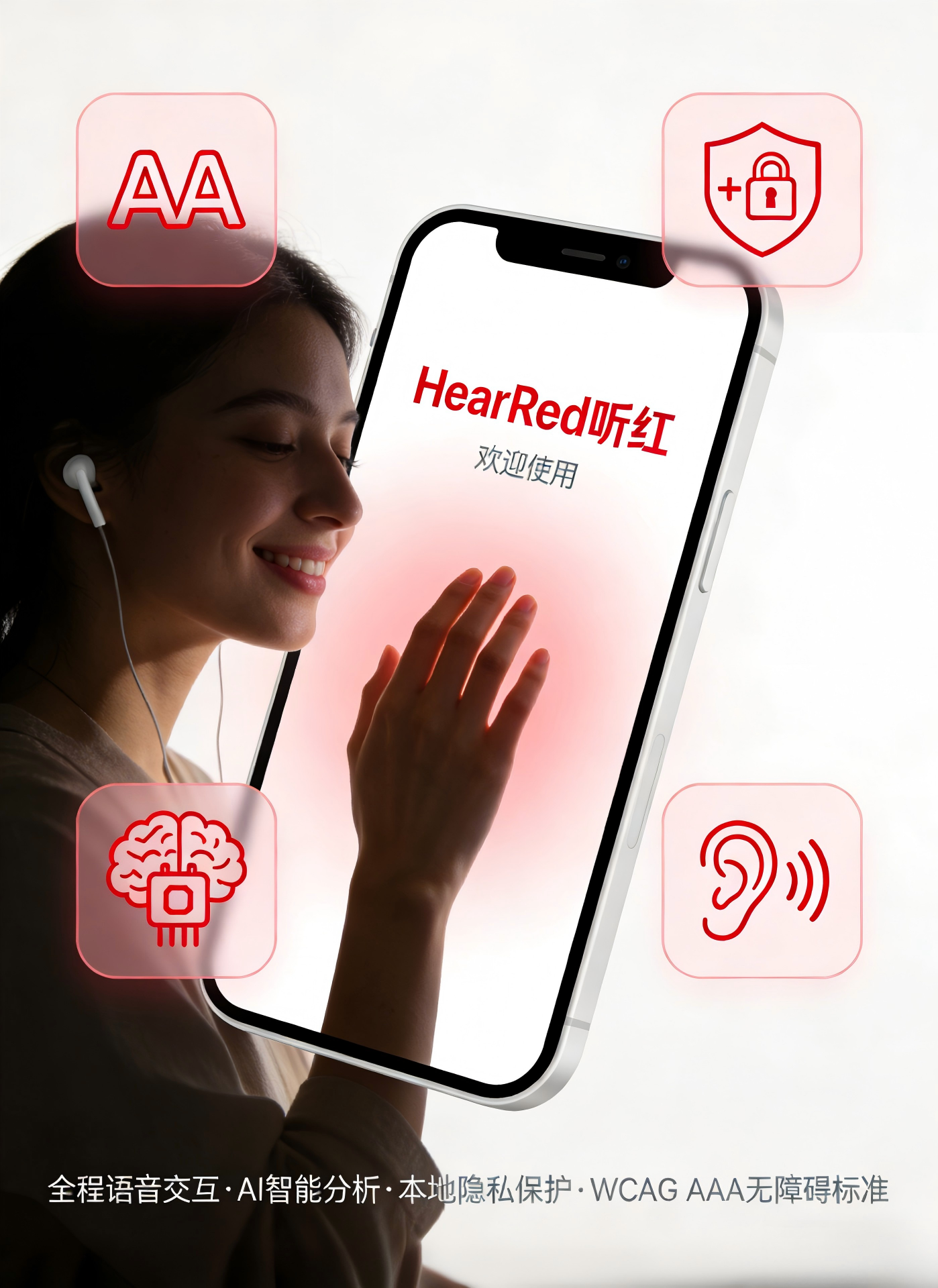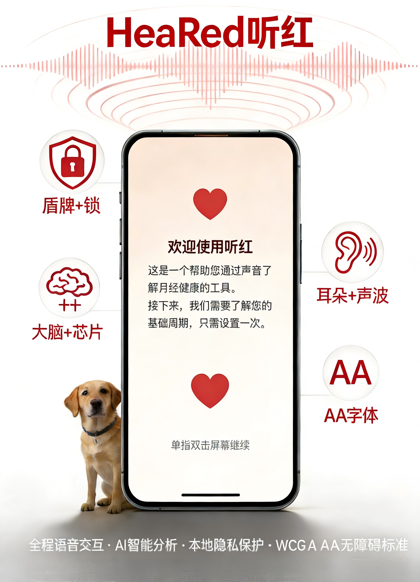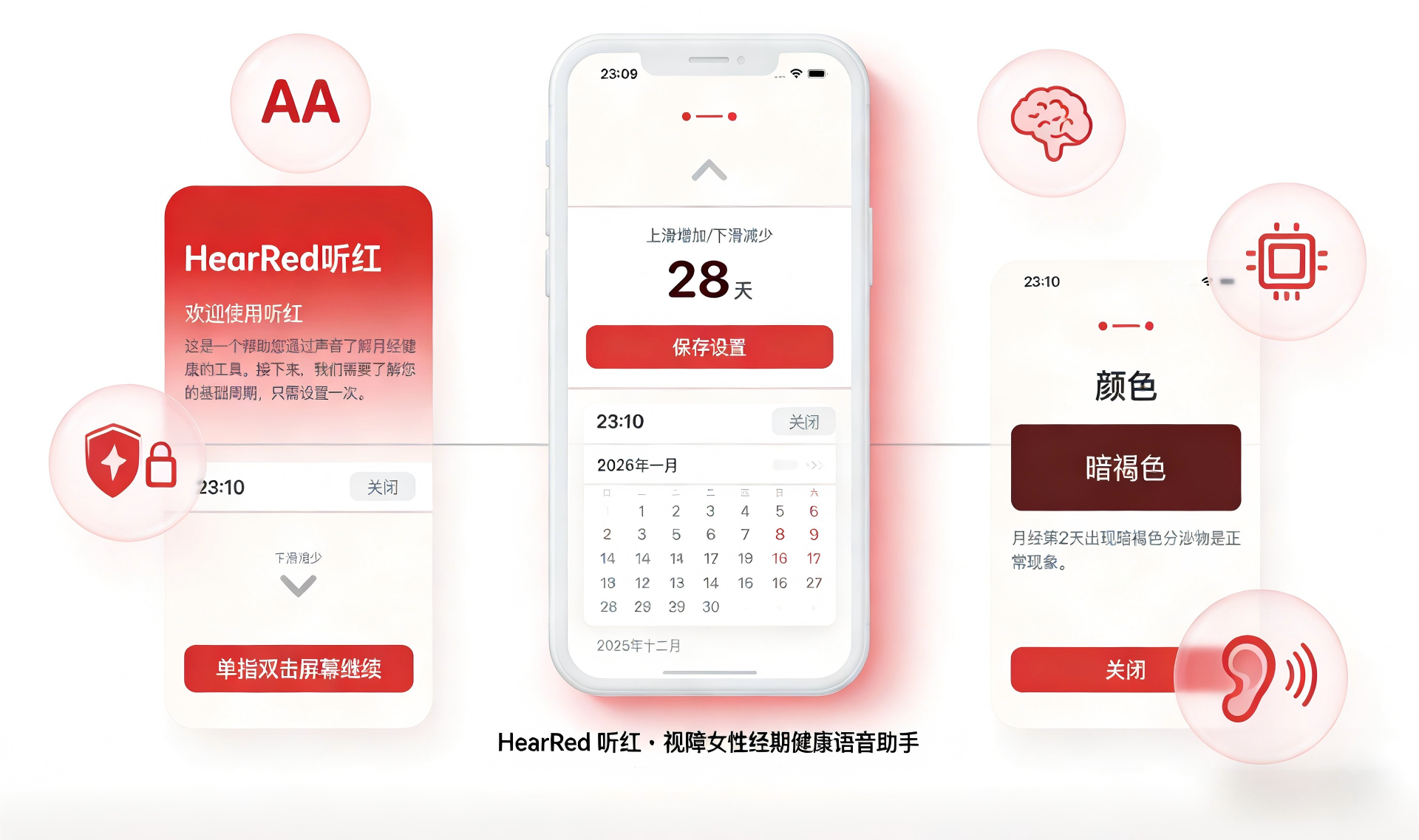 HearRed(听红)是一款专为视障女性设计的经期健康语音助手,通过全程语音交互和AI智能分析经血颜色,帮助用户便捷、私密地管理健康。应用完全适配屏幕阅读器,支持语音操作与本地AI分析,数据仅存于本地,不上传云端,确保隐私安全。