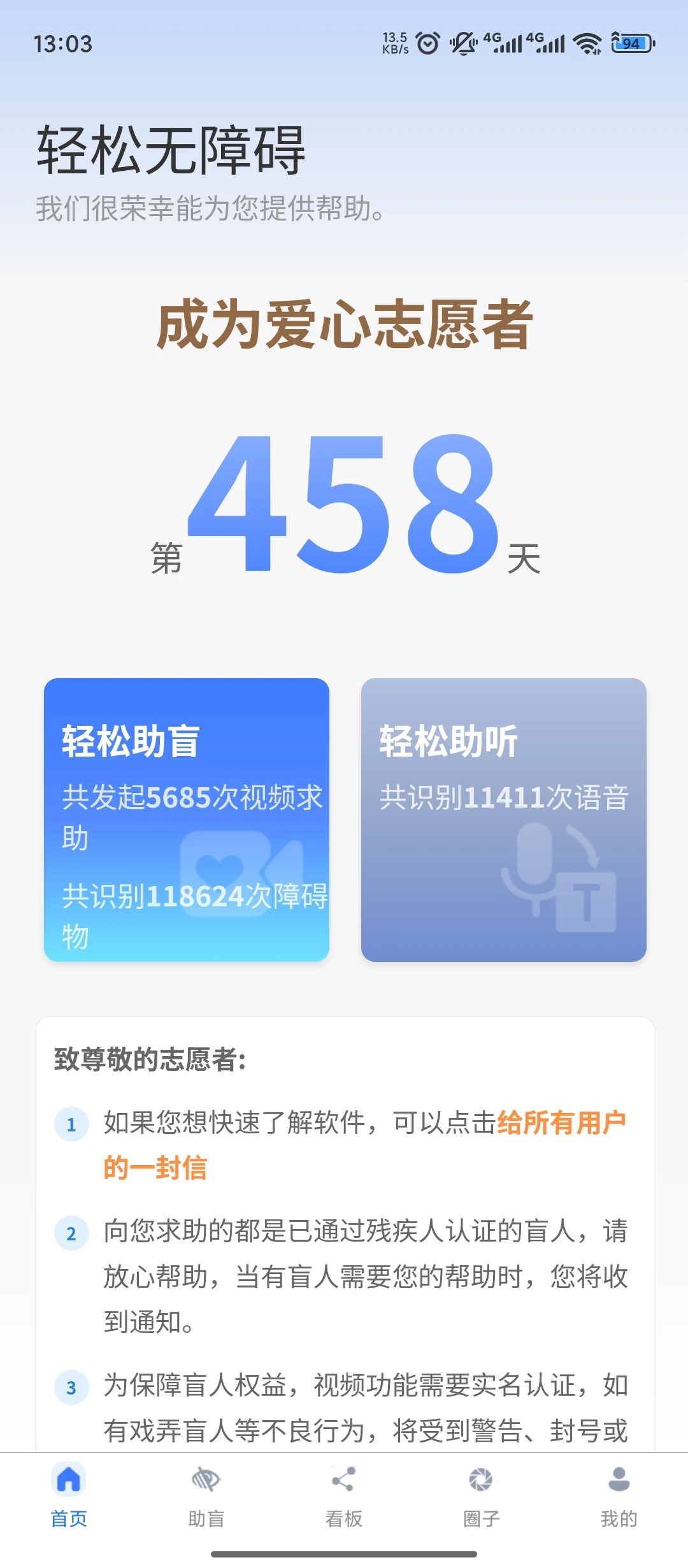视障用户可随时通过视频联系志愿者,获得实时视觉描述与帮助;同时应用内置伴行功能,可识别门牌号、路牌、电梯、厕所及前方障碍物,为出行提供语音提示与安全保障。物品识别模块支持一键拍摄,语音播报物体信息;圈子功能则方便用户互动交流与反馈。