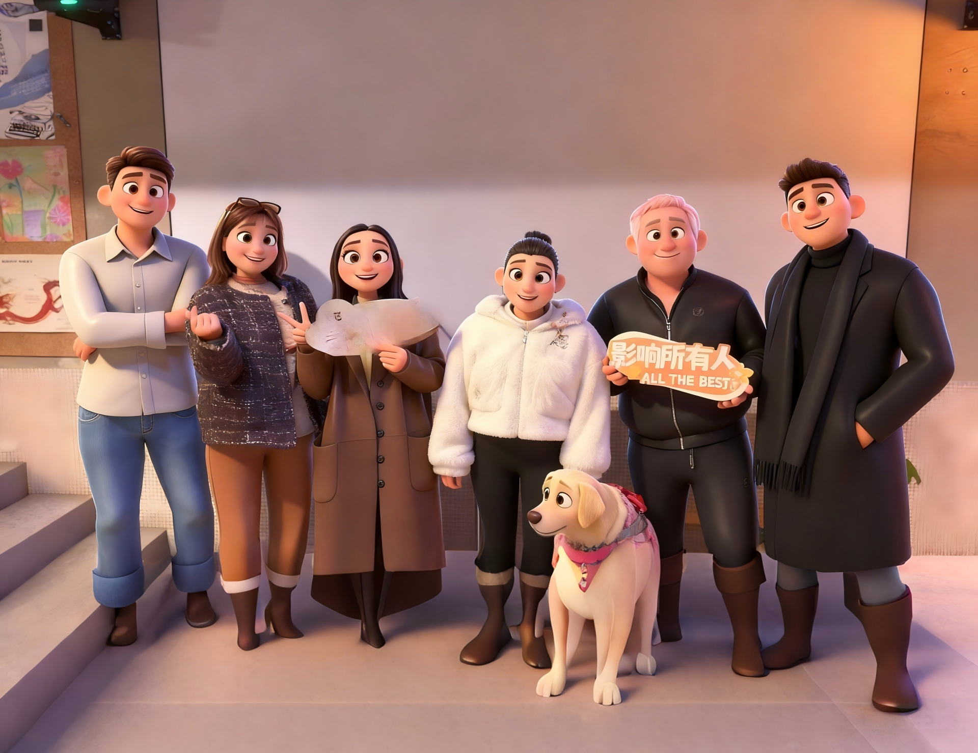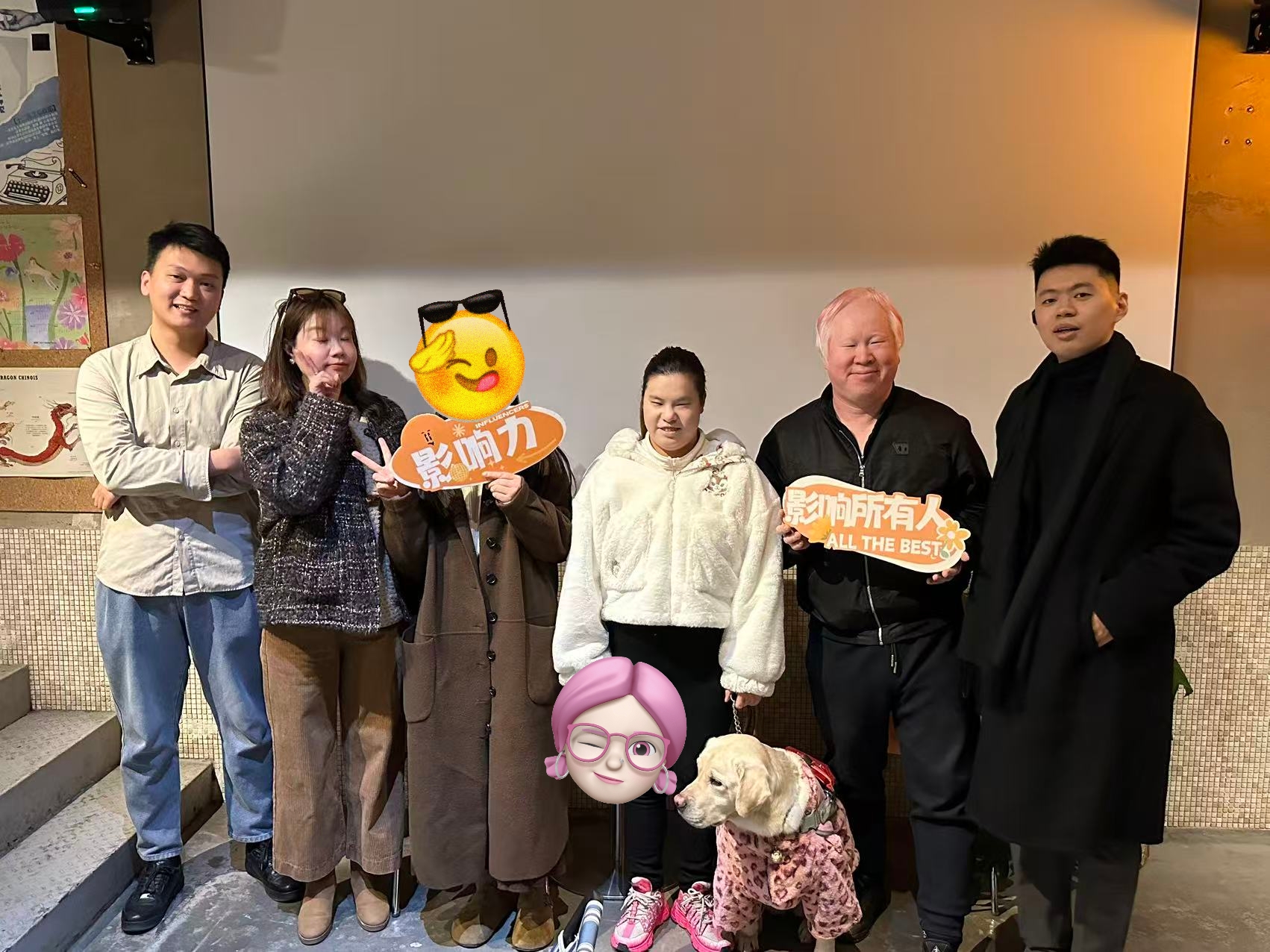 (从左往右:华强、Sandra、筱筱、寅青、导盲犬盖亚、猪八戒、奥杰)
