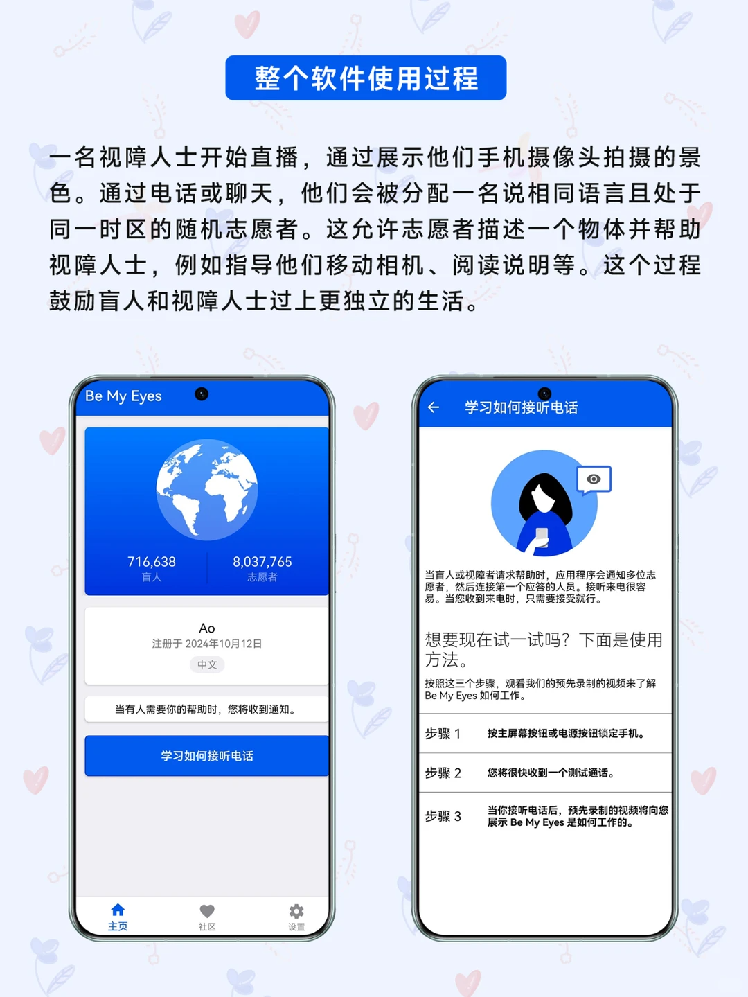 Be My Eyes 是一款为盲人或低视力人群打造的免费辅助应用,通过三大核心工具提供全天候视觉支持:用户可以直接联系全球超过700万、讲185种语言的志愿者进行实时视频对话;