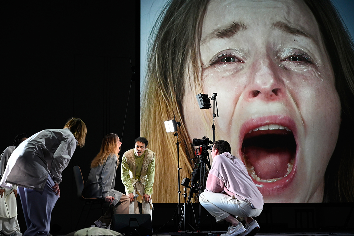 导演 Christopher Rüping 将 Kane 的文本转化为一场剧场实验装置:当 Maja Beckmann、Benjamin Lillie、Sasha Melroch 与 Steven Sowah 朗诵文本时,我们同时注视第五位演员——Wiebke Mollenhauer——看她如何对文本作出反应。随后会发生什么?也许,我们会重新与那些关于暴力的极端描写建立连接——正是这些描写让 Kane 在 1990 年代声名大噪。也可能,我们看见的是自己:一个在“治疗”中的社会,对被认可与被肯定的饥渴似乎永无止境。又或者,这个夜晚真的能让脑海里那些饥饿的声音,在某个瞬间悬置、停驻?