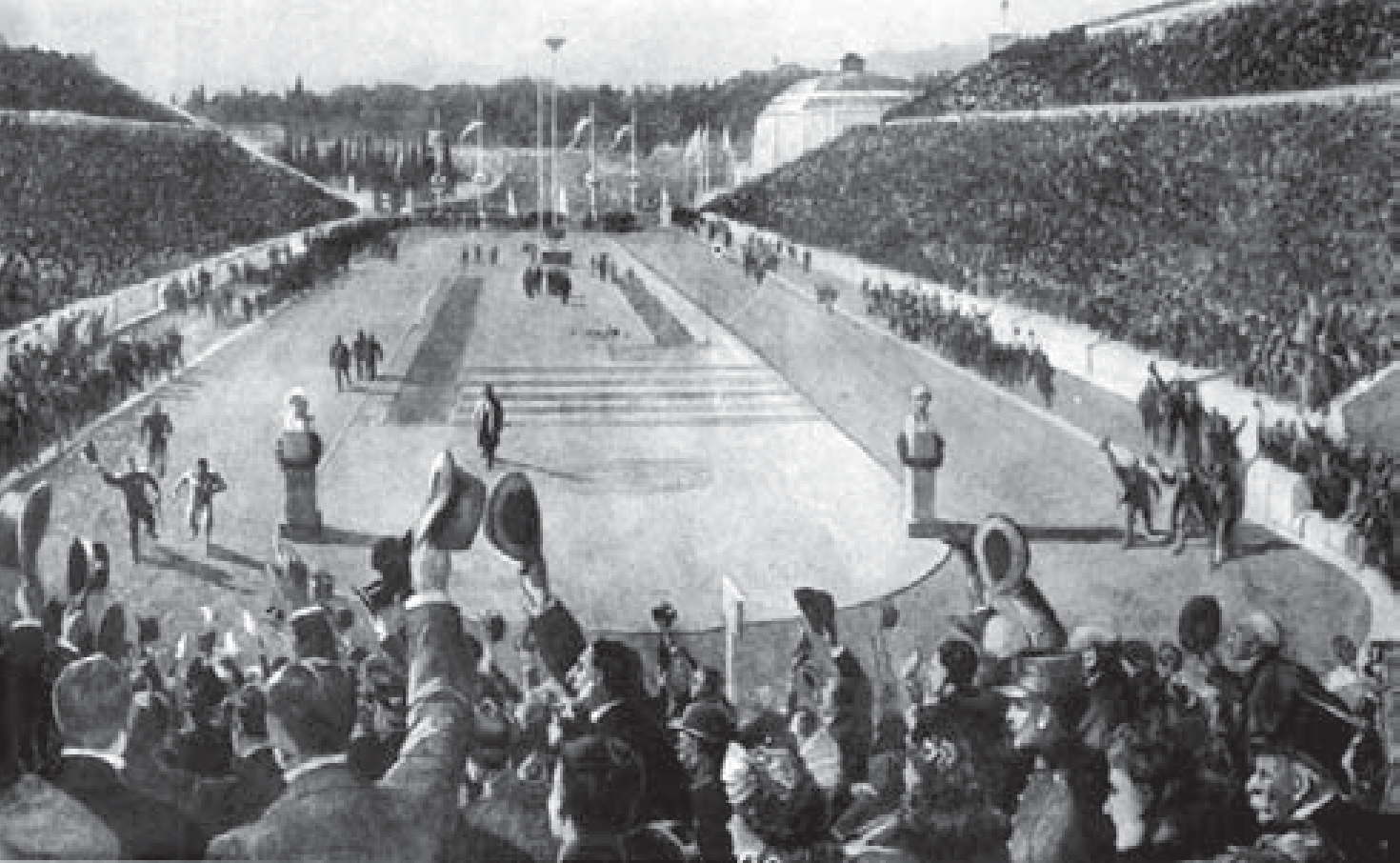 画面描绘泛雅典娜体育馆,在第一届现代奥运会马拉松比赛期间,人群欢呼。