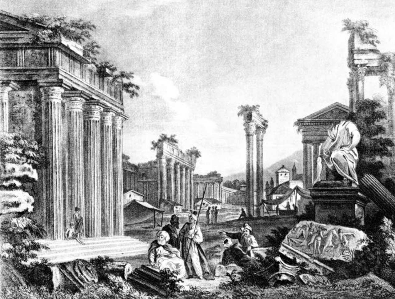 1832年发表于伦敦的描绘雅典废墟的浪漫画面,也代表着十五十六世纪欧洲学者认为雅典应该有的样子。
