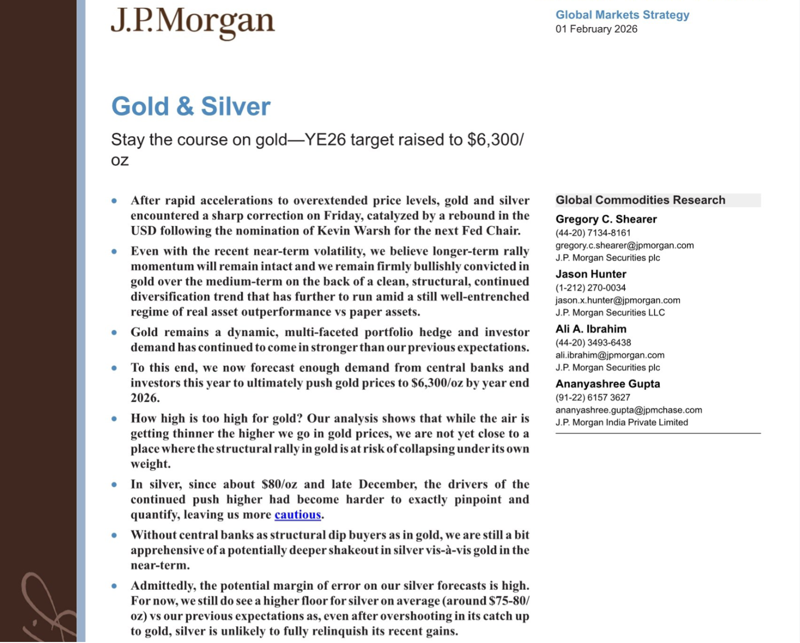 2026年2月1日,摩根大通发布《黄金与白银:坚守黄金多头——2026年末目标价上调至6300美元/盎司》研报,明确短期波动不改黄金中长期上涨趋势,而白银因缺乏核心支撑面临更大回调风险。