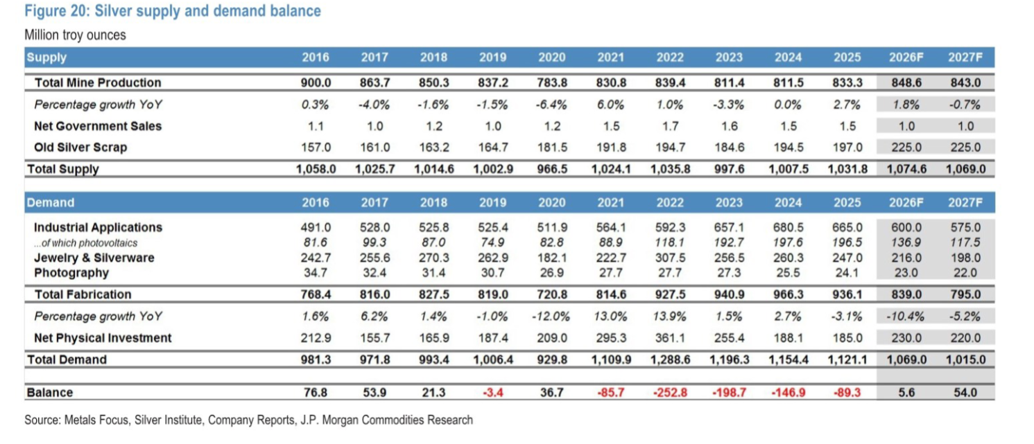 白银的前景则相对谨慎。《图1》显示,白银2026年目标价为81美元/盎司,虽较此前预测上调44%,但波动风险显著更高。研报指出,白银缺乏央行作为结构性买家,且上涨驱动因素模糊,目前支撑位在75-80美元/盎司。长期来看,《图20:白银供需平衡表》(第15页)显示,2026年白银市场将从赤字转为560万盎司盈余,2027年盈余扩大至5400万盎司,工业需求中光伏用银预计下降30%,供需结构变化将推动金银比向70-75回归。